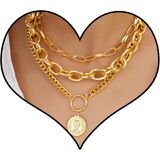 Layered Gold Necklaces: These Coin Layered Necklaces use stacked necklace design, Cuban chain,gold chain,herringbone chain,gold toggle clasp necklace free collocation, highlighting the texture.