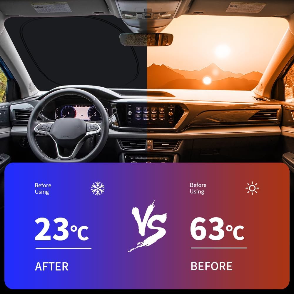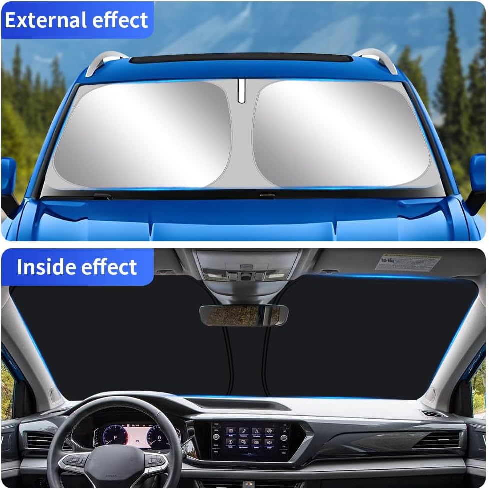 ✅[حماية السيارة وحماية الخصوصية] سواء في الصيف أو الشتاء، يمكنها حجب الشمس خارج الزجاج الأمامي، وتمنع بشكل فعال حروق الشمس على لوحة الأدوات، وتأخير شيخوخة تشقق التحكم. يمكن أن يمنع الغرباء من النظر داخل السيارة، مما يمنحك مساحة سيارة أكثر خصوصية ودون إزعاج.