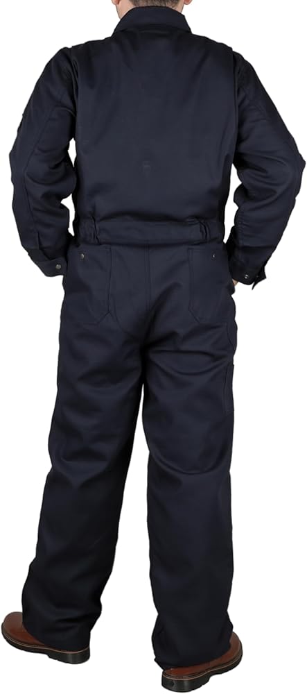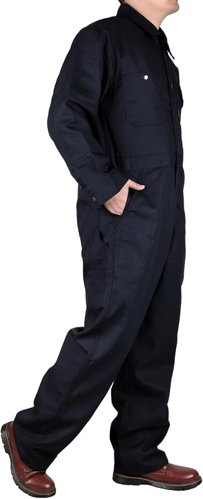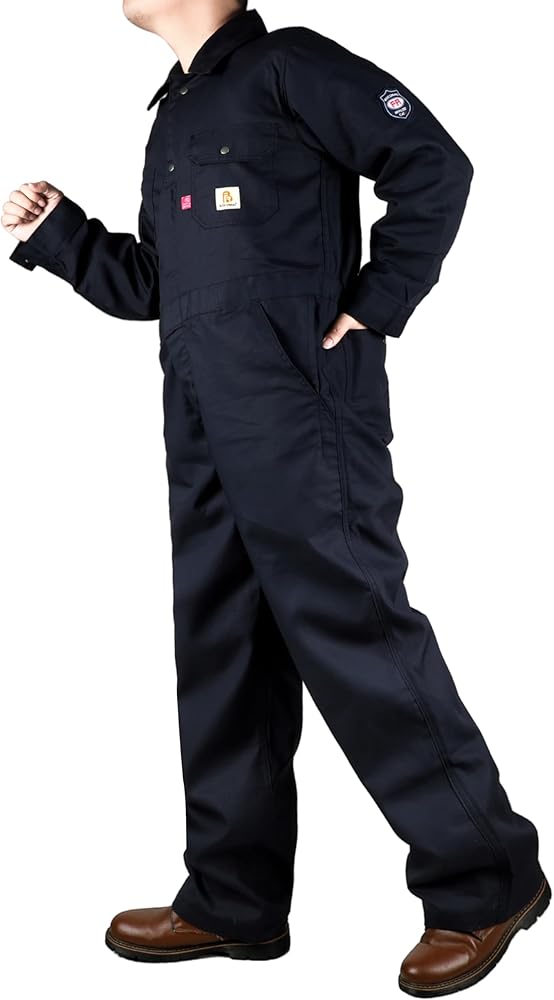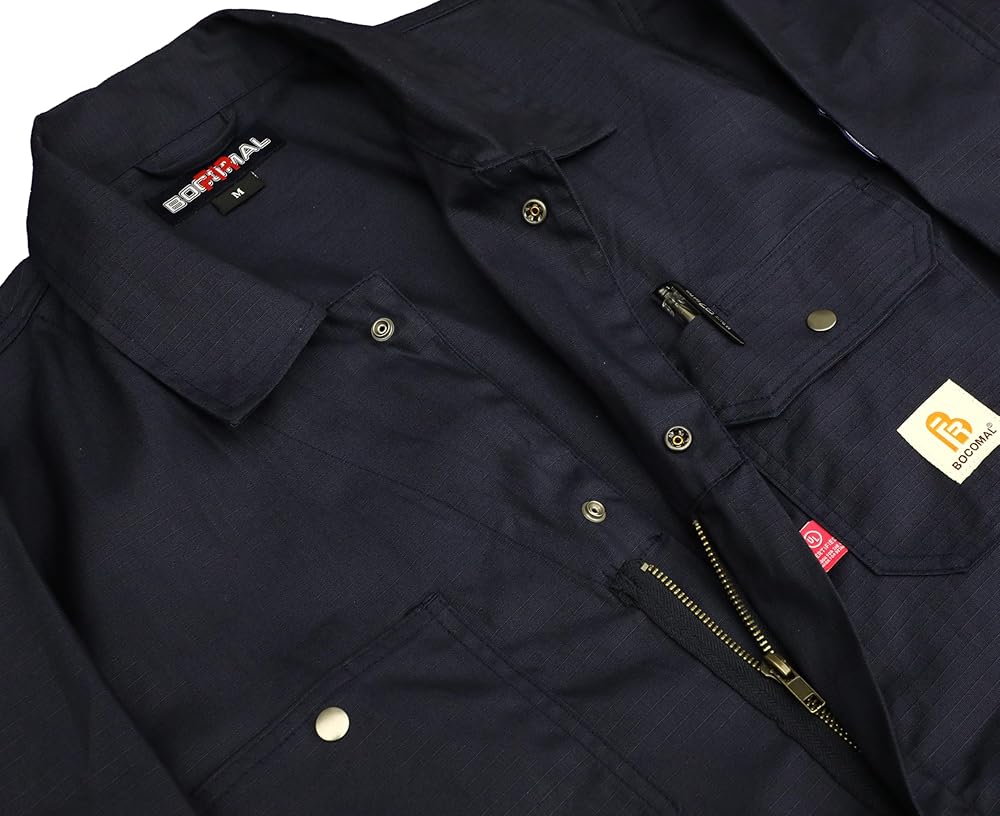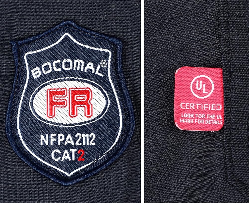 مواد FR: قطن مقاوم للتمزق بوزن 6oz، لمسة نهائية مقاومة للماء والبقع. معالج بطبقة FR، سحاب FR. علامة FR على جيب القلم والمزيد من معلومات FR بالداخل على البطاقة حول شهادة UL.