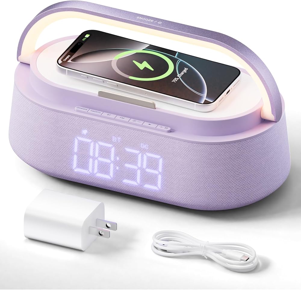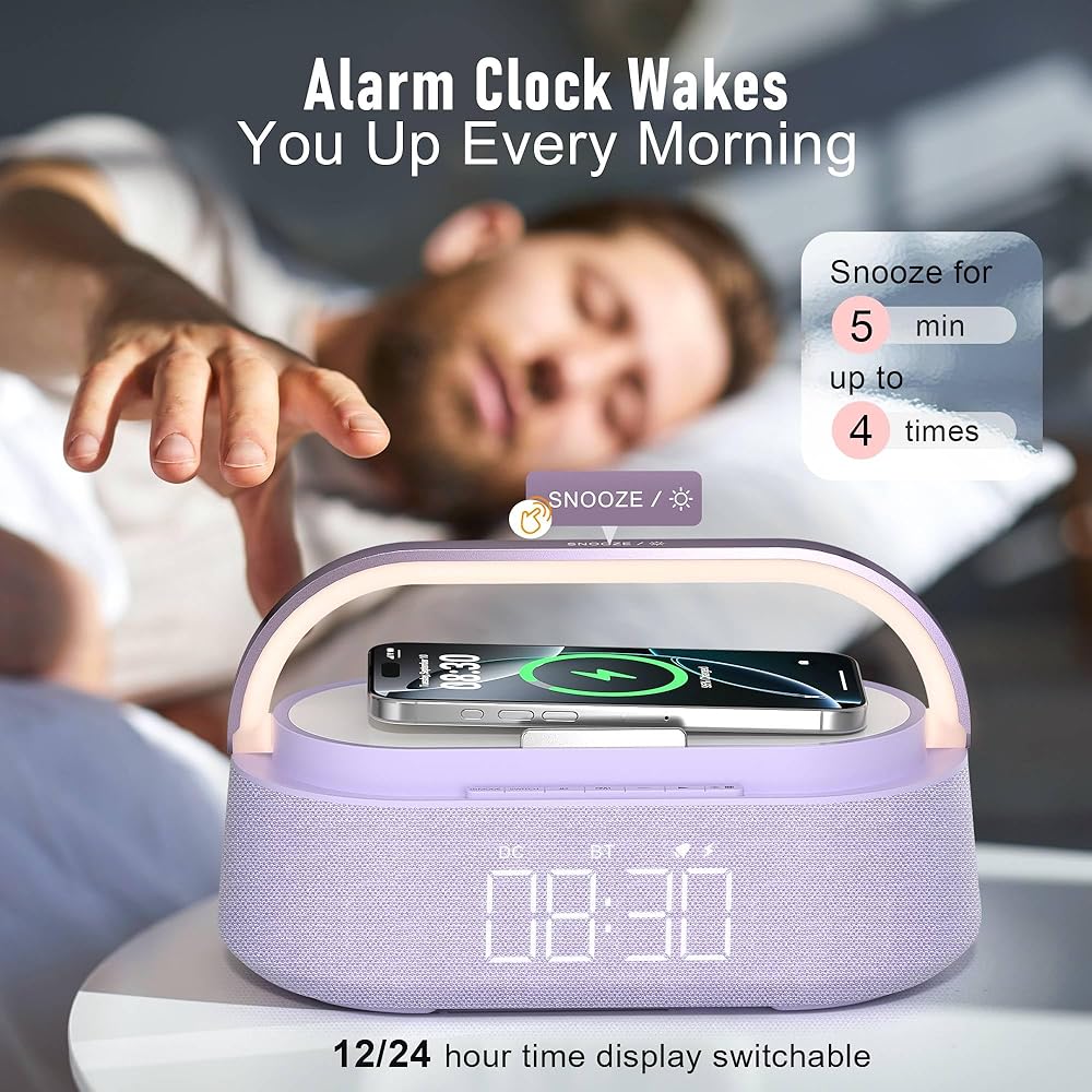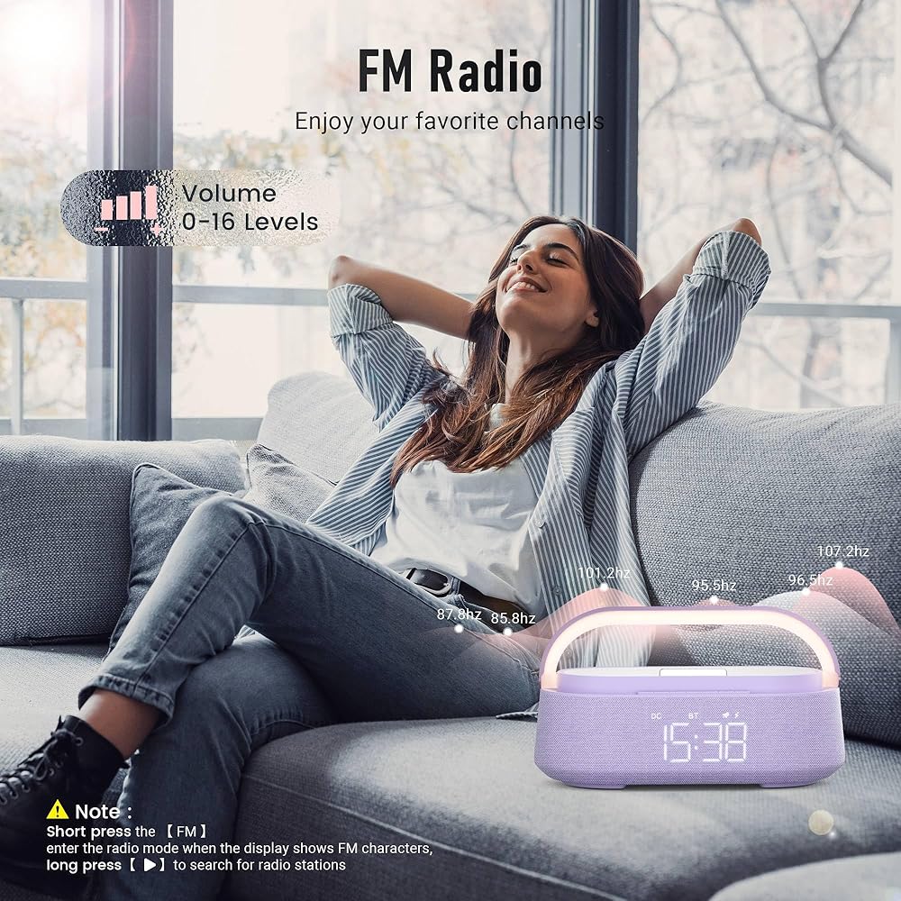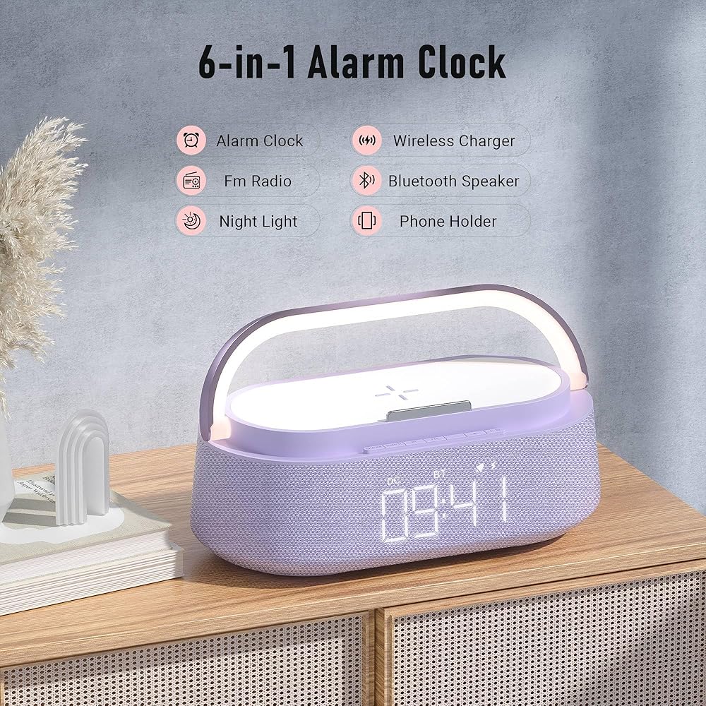 تصميم 6 في 1: ساعة منبه فريفيش تدمج مكبر صوت بلوتوث وراديو إف إم وساعة منبه رقمية وشاحن لاسلكي وإضاءة ليلية قابلة للتعديل وحامل هاتف في آن واحد. تصميمه المتكامل يمكن أن يلبي احتياجاتك المختلفة طوال اليوم ويرافقك من الصباح إلى الليل.