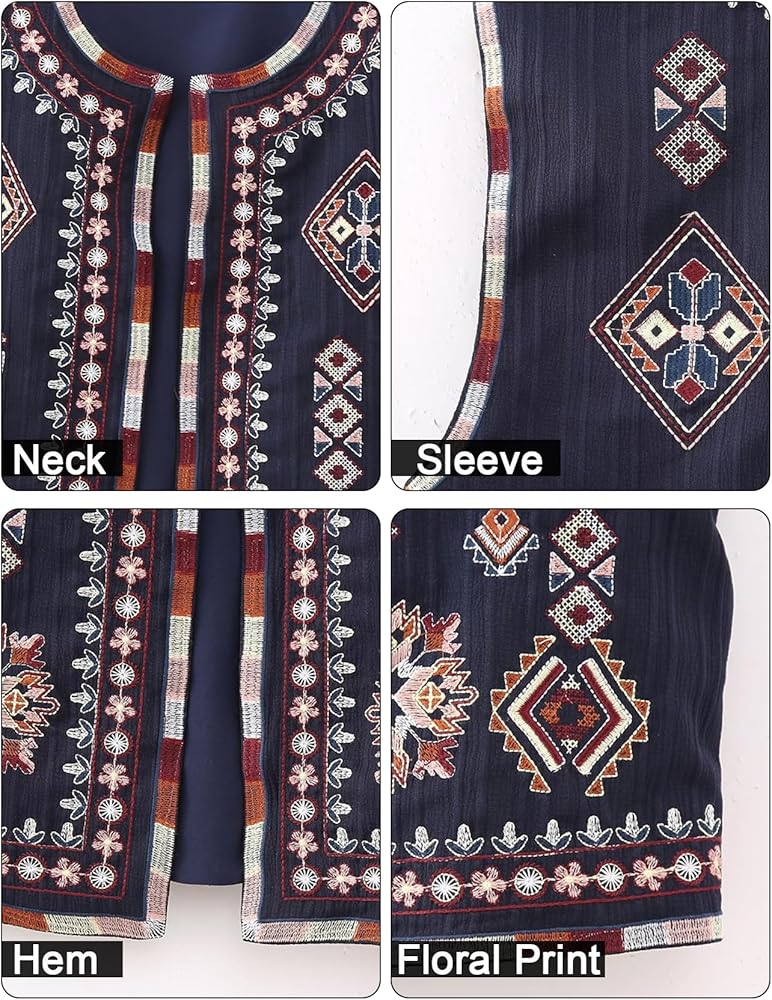 السمات: سترة بوهو كلاسيكية من السبعينيات والثمانينيات بمقاس مريح، بدون أكمام، خفيفة الوزن عند الارتداء، تصميم طباعة زهور أنيق، مفتوح من الأمام، سترة مطرزة متعددة للاختيار من بينها، يمكن ارتداؤها طوال العام.