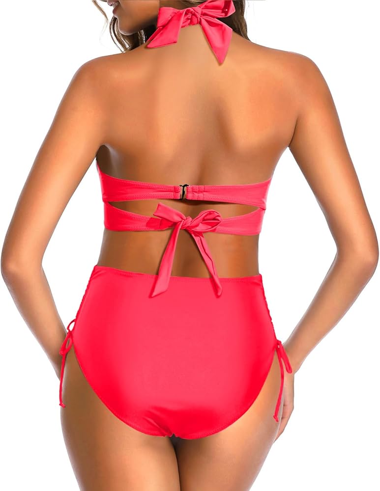 بدلة سباحة مكونة من قطعتين للنساء: تشتمل بدلة السباحة الكلاسيكية هذه على قطعة علوية من البكيني ذات ربطة عنق قابلة للتعديل وجزء سفلي من البيكيني برباط