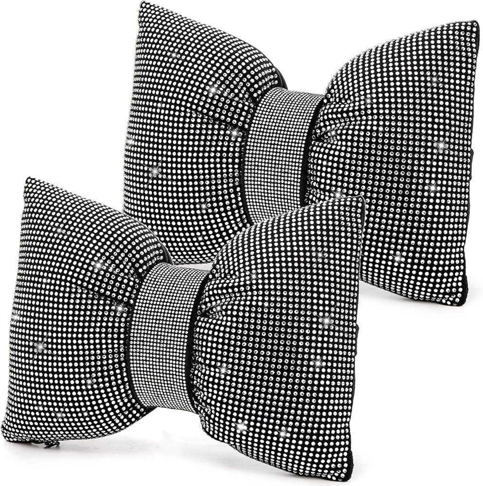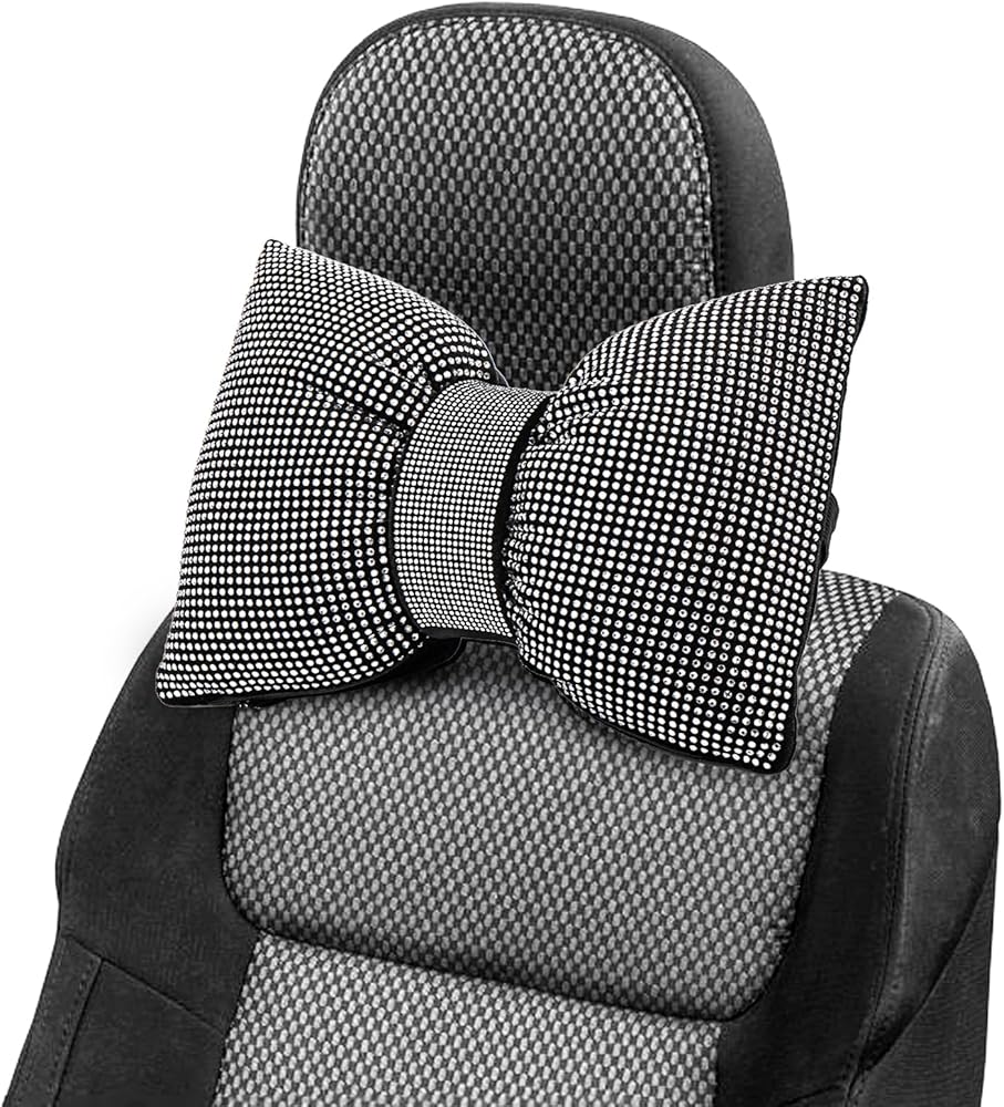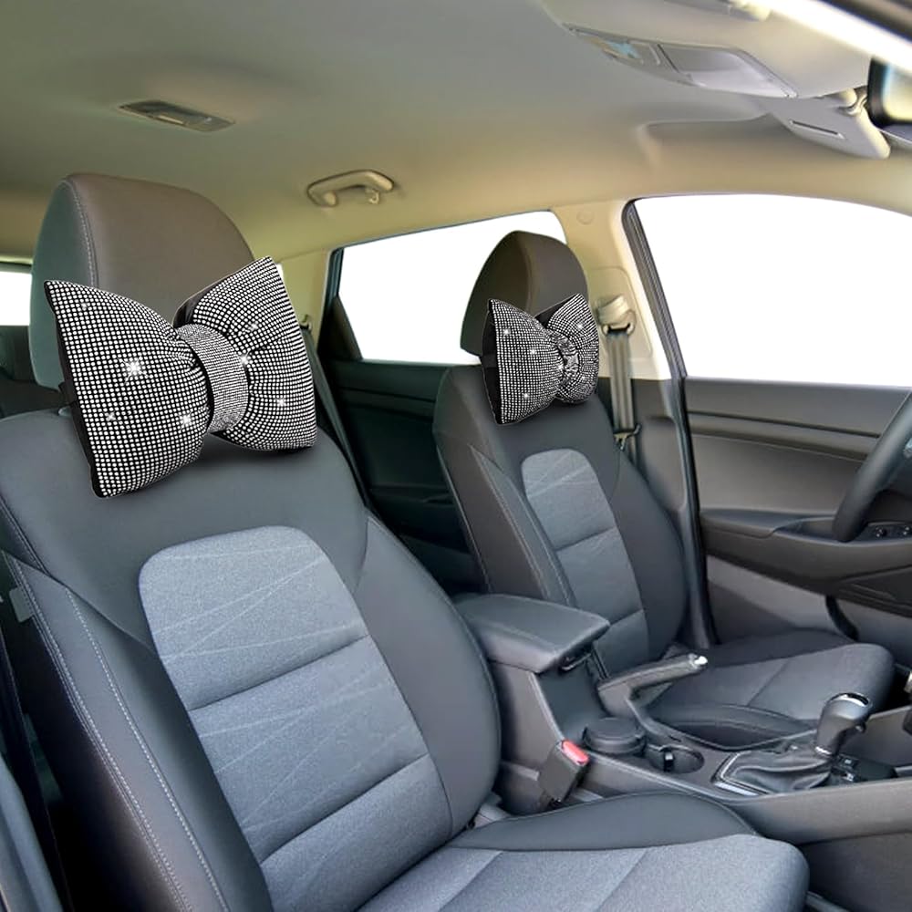 Lawei قطعتان من وسائد السيارة اللامعة، وسادة رقبة لمسند رأس السيارة من حجر الراين للقيادة، وسادة مريحة لراحة الرأس ودعم الرقبة للسفر، وسادة داخلية على شكل فيونكة من الكريستال الأبيض للنساء للفتيات