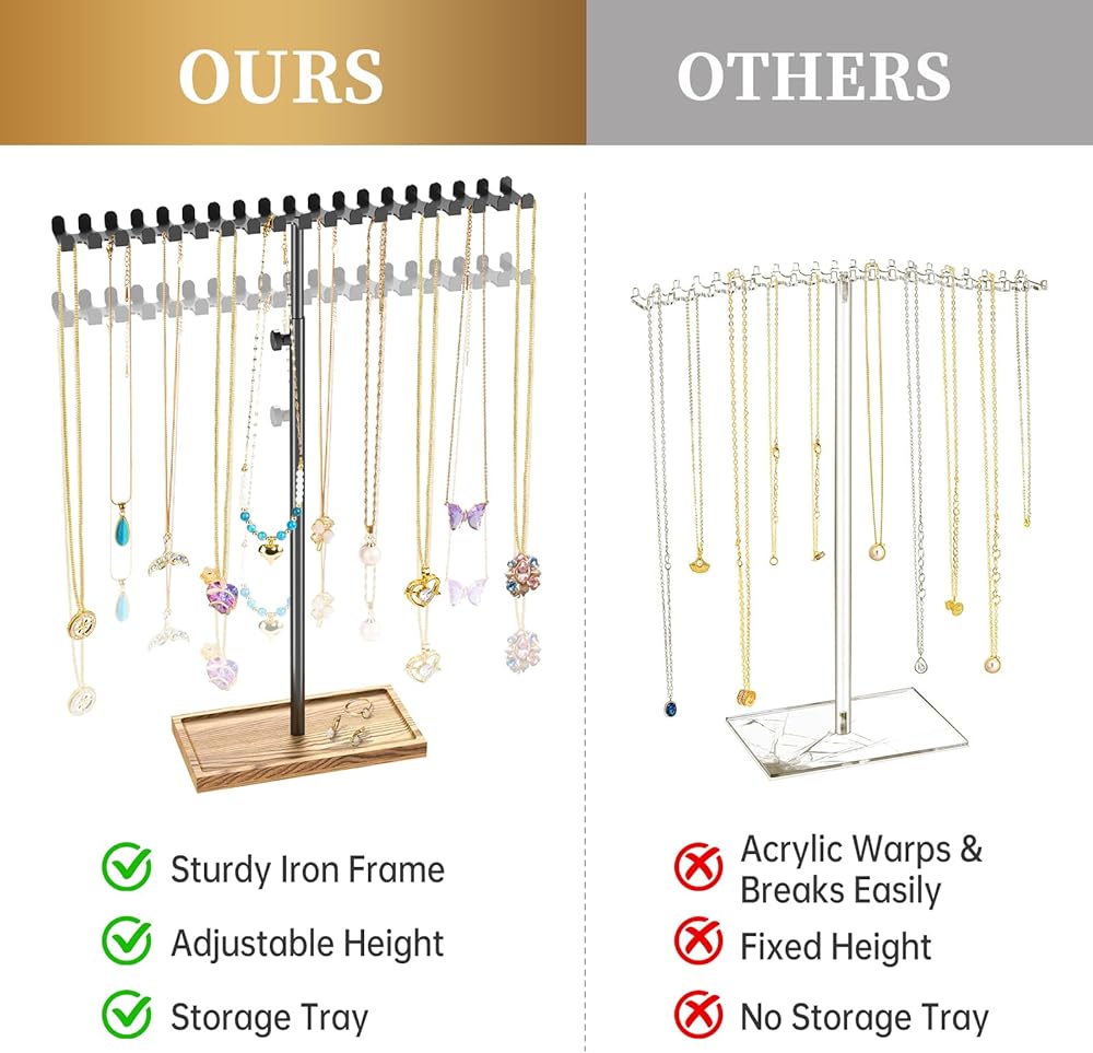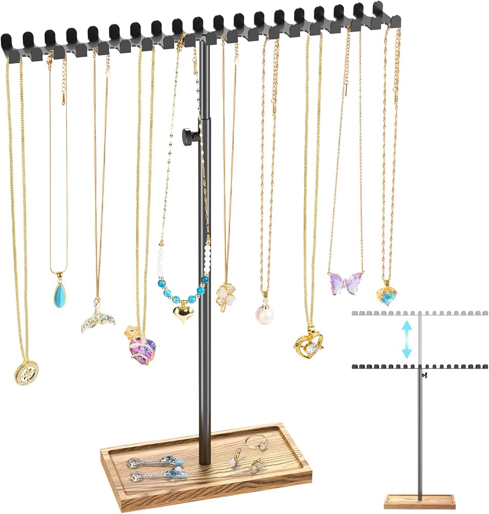 رف مجوهرات من الحديد بارتفاع قابل للتعديل من NiHome، حامل قلادة مضاد للتشابك مع صينية سفلية مساحة إضافية للخواتم والأقراط، تنظيم سهل التجميع للقلائد الطويلة جدًا