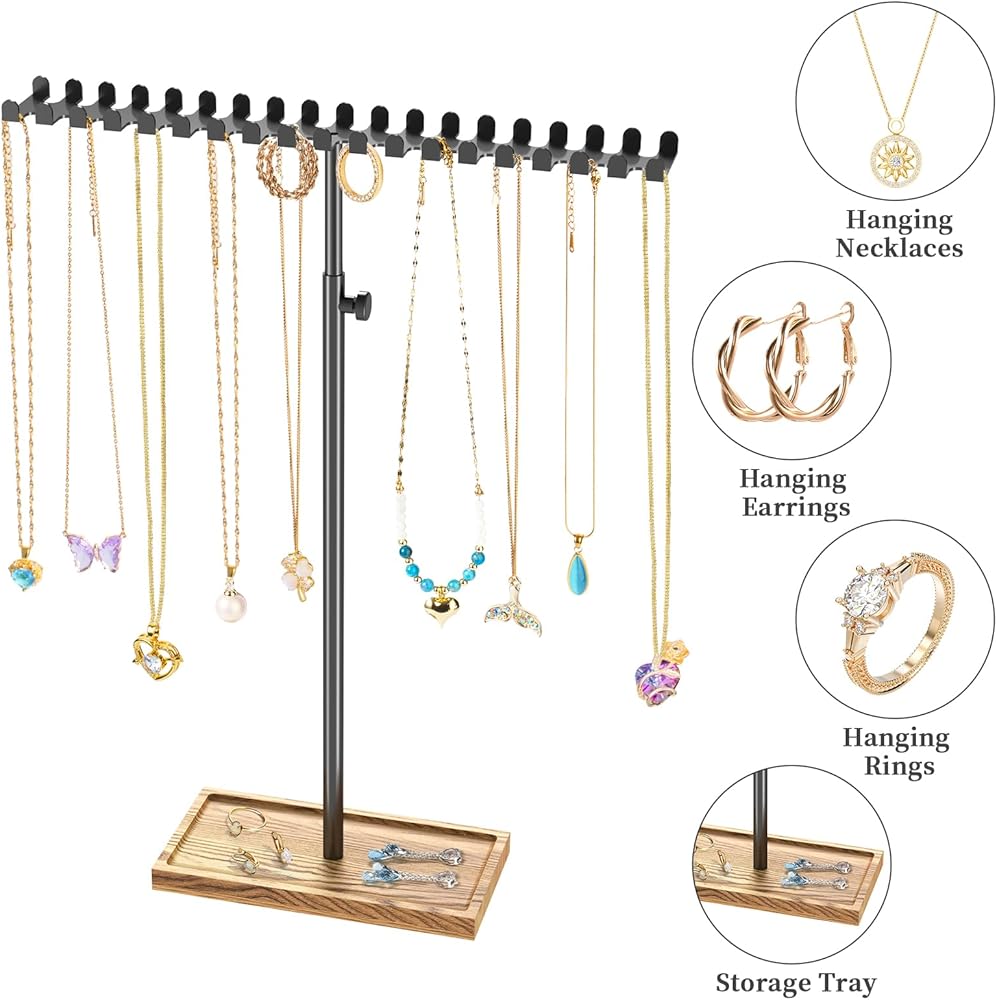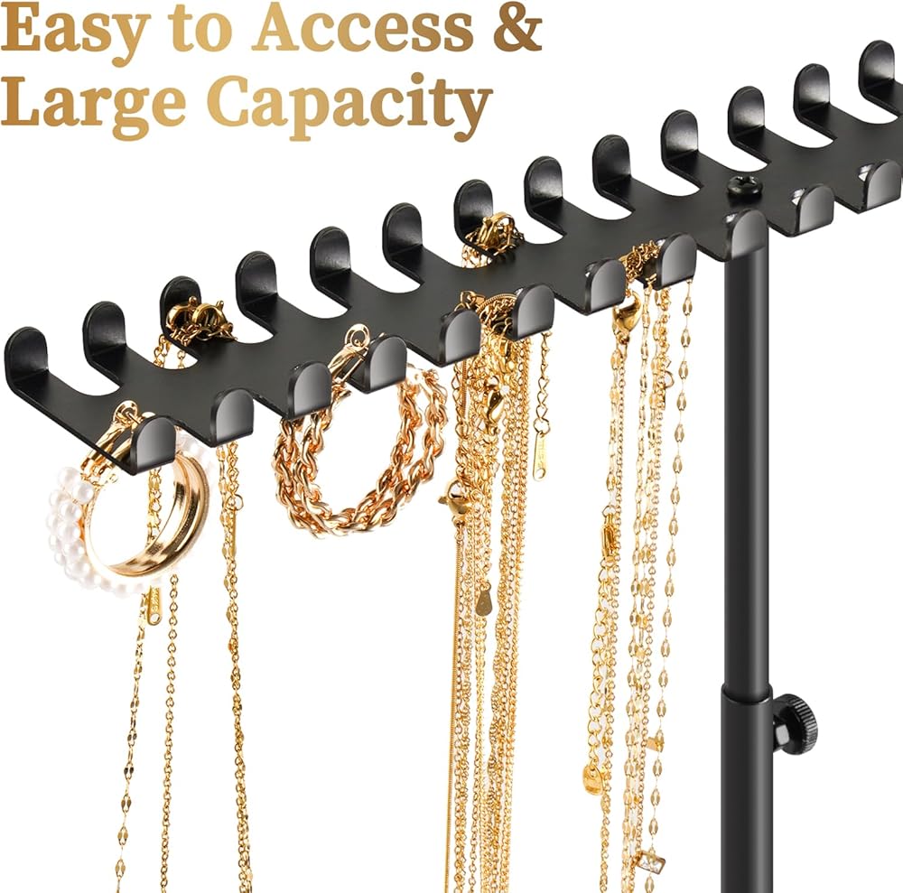NiHome Adjustable Height Ironwork Jewelry Rack, Anti-Tangle Necklace Holder with Bottom Tray Additional Space for Rings and Earrings, Easy Assembly Neat Organization for Extra-Long Necklaces