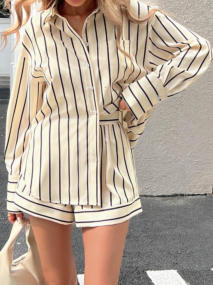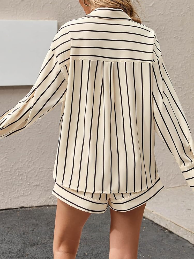 • التصميم: تشتمل هذه المجموعة المكونة من قطعتين للنساء على قميص طويل الأكمام، وطية صدر على شكل حرف V، وجيب أمامي على الصدر، وأساور عريضة مع تفاصيل أزرار، وحاشية منحنية، ومقاس مريح كبير الحجم، وسروال قصير متطابق مع جيوب، وحزام خصر مرن خلفي يعزز راحة الارتداء