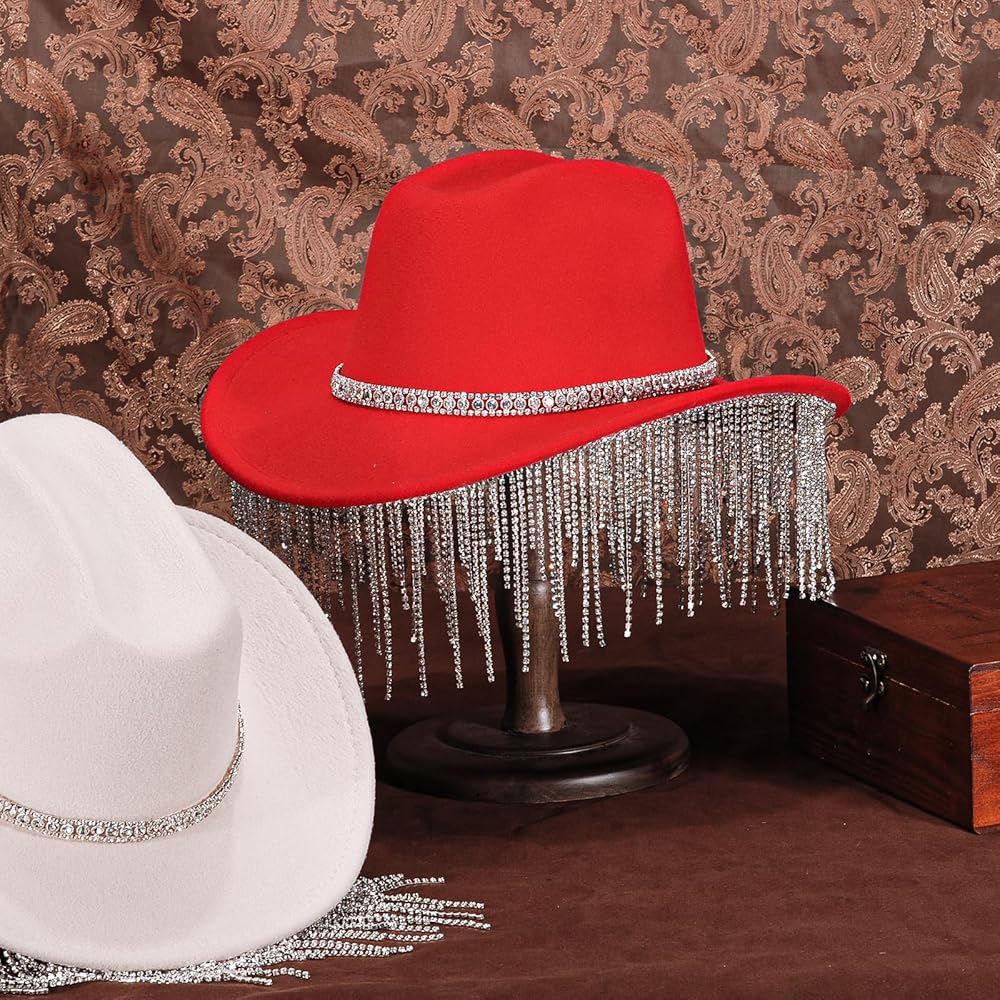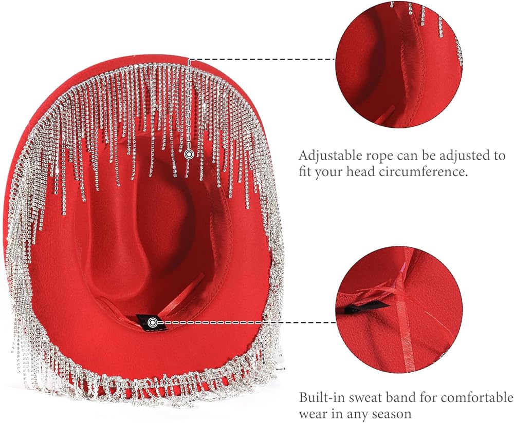 المرأة حجر الراين راعية البقر قبعة واسعة حافة الماس بريق الغربية قبعة رعاة البقر بلينغ راعية البقر قبعة للنساء مع شرابة