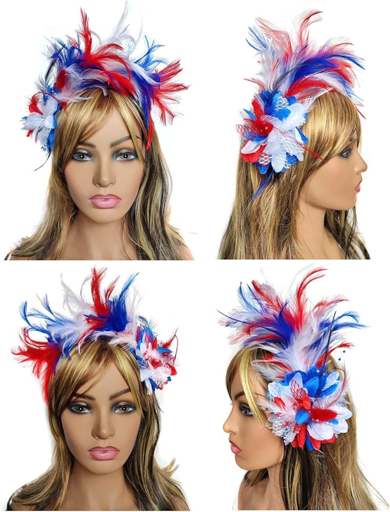 • 🧡【4th of July Feather Fascinator】This chic headpiece nods to vintage style with fluttering feathers and cascading flower. Fashionable style matches everything, such as with 1920s vintage clothing, independence day party and any modern outfit