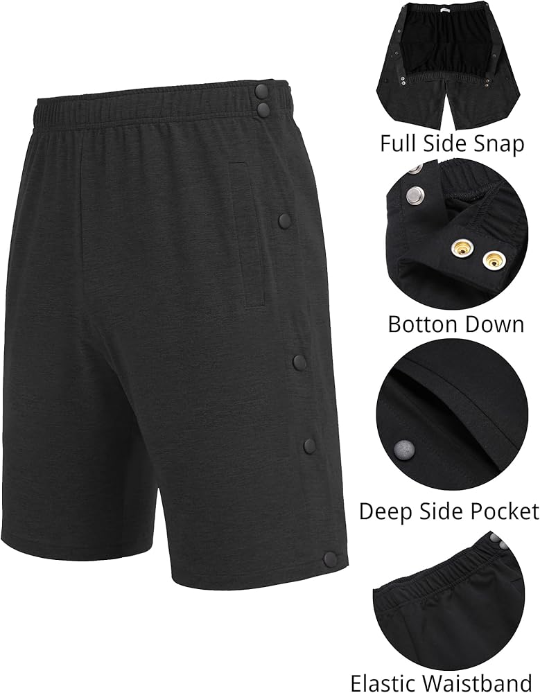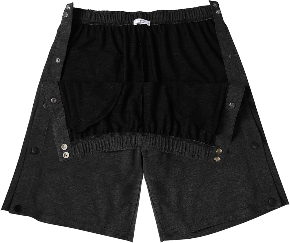 • 【شورت بإبزيم جانبي】شورت مزود بأزرار كبس معدنية مخفية على كلا الجانبين لسهولة الارتداء والخلع، مع شورت قابل للتمزيق مفتوح من الجانب بالكامل لتجنب ملامسة الجرح أو الضمادات أو القوالب لسهولة استخدام الدواء والمراقبة الطبية.