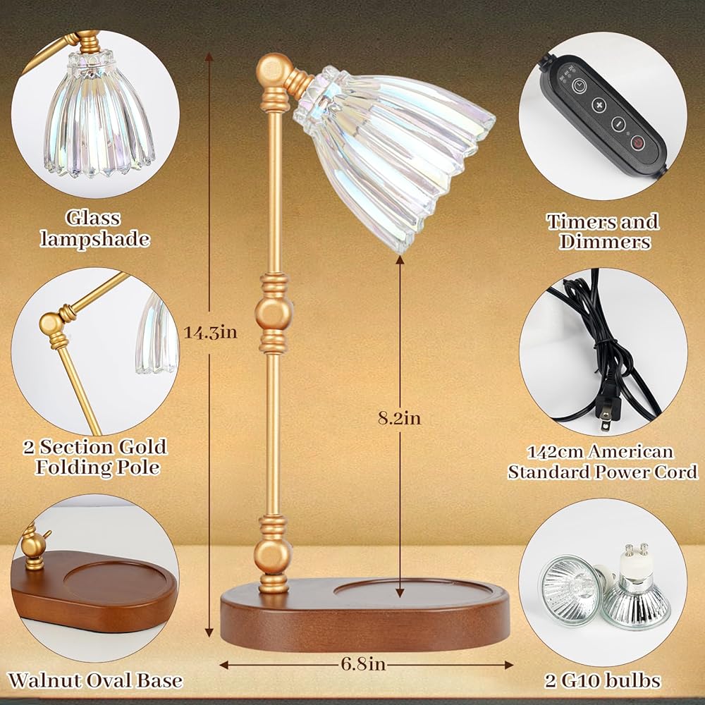 Exquisite home decoration: This candle light warmer lamp is a stylish combination of walnut oval base, 2-section golden folding pole and multicolored glass lampshade, combining classic elegance with modern aesthetics. It is both functional and decorative, suitable for bedroom decoration, living room decoration, study room, yoga room, etc.