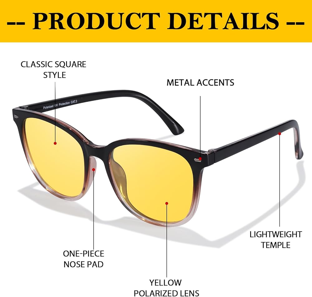 عدسات صفراء مشرقة: يتميز هذا الزوج من النظارات بعدسات صفراء تضيء رؤيتك الليلية، مما يساعدك على تعزيز قدراتك البصرية أثناء القيادة ليلاً. يوفر لك إضاءة أكثر وضوحًا على الطرق ذات الرؤية الضعيفة وظروف الإضاءة المنخفضة، لذلك لا داعي للقلق بشأن عدم القدرة على رؤية ظروف الطريق بوضوح وإلغاء خططك لرحلات القيادة