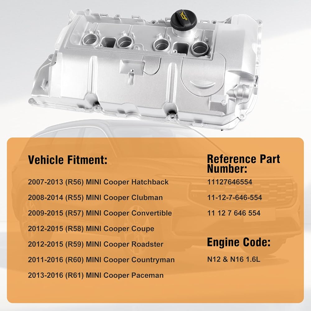 【Vehicle Fitment】N16 and N12 Engine Aluminum Valve Cover Kit fit for 2007 2008 2009 2010 2011 2012 2013 R56 MINI Cooper Hatchback; 2008-2014 R55 MINI Cooper Clubman; 2009-2015 R57 MINI Cooper Convertible; 2012-2015 R58 MINI Cooper Coupe; 2012-2015 R59 MINI Cooper Roadster; Mini Cooper Countryman (r60) 2011 2012 2013 2014 2015 2016 all models; 2013-2016 R61 MINI Cooper Paceman (the Mini Cooper non-S models)