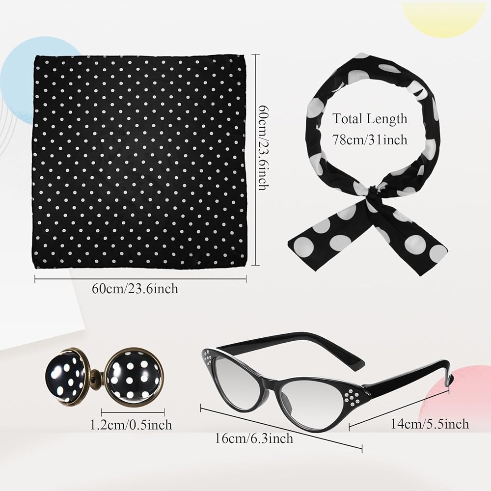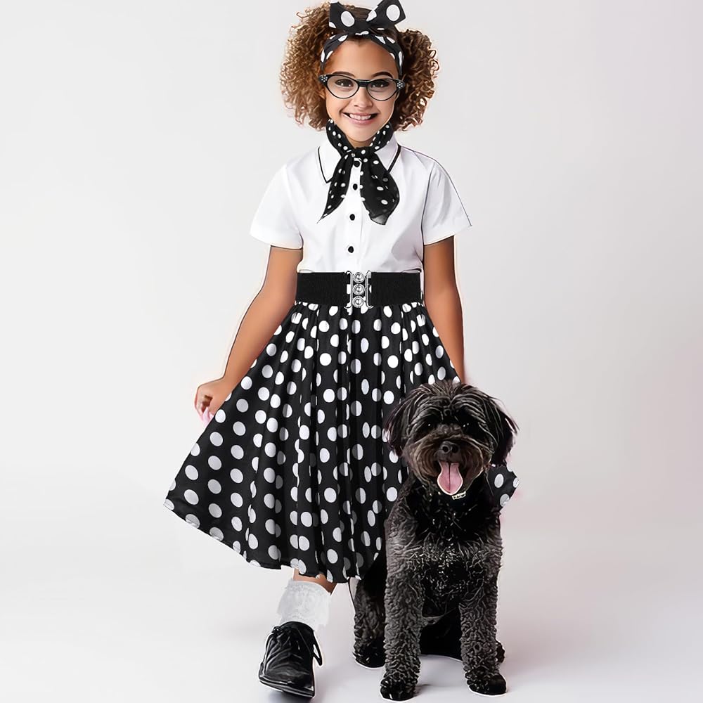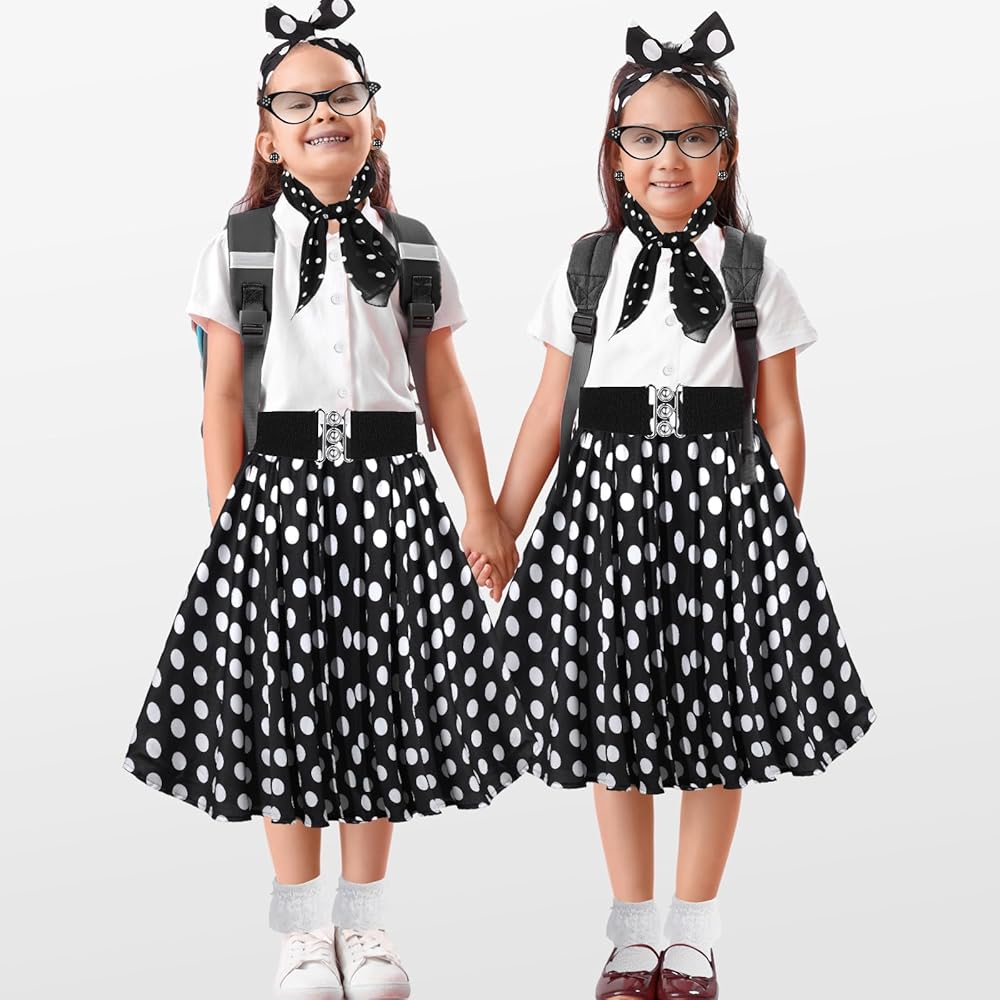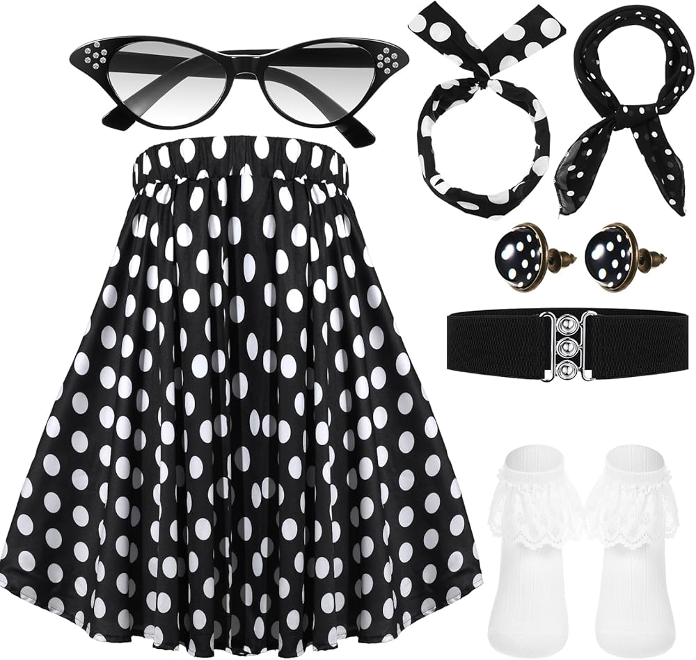 • مجموعة إكسسوارات أزياء الأطفال في الخمسينيات: يوفر لك هذا المنتج كل ما تحتاجه لإعادة مظهر الخمسينيات الكلاسيكي لحدث قادم؛ تتضمن 1 تنورة بودل شيفون، 1 وشاح شيفون، 1 زوج من النظارات البلاستيكية، 1 عصابة رأس باندانا، 1 حزام، 1 زوج من الأقراط، 1 زوج من الجوارب القطنية؛ كل قطعة في مجموعة أزياء الخمسينيات للأطفال والبنات تكمل الأخرى، مما يوفر لمحة شاملة وحقيقية عن الماضي