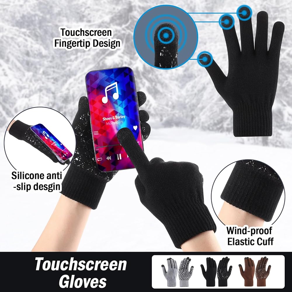 Practical Touchscreen Gloves: the acrylic knit gloves in our set not only keep your hands warm, but also feature touchscreen compatibility on thumbs, forefingers and middle fingers, letting you use your phone or tablet without removing your gloves