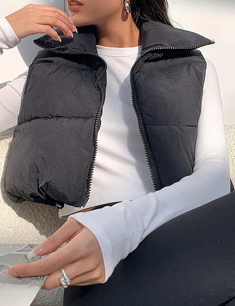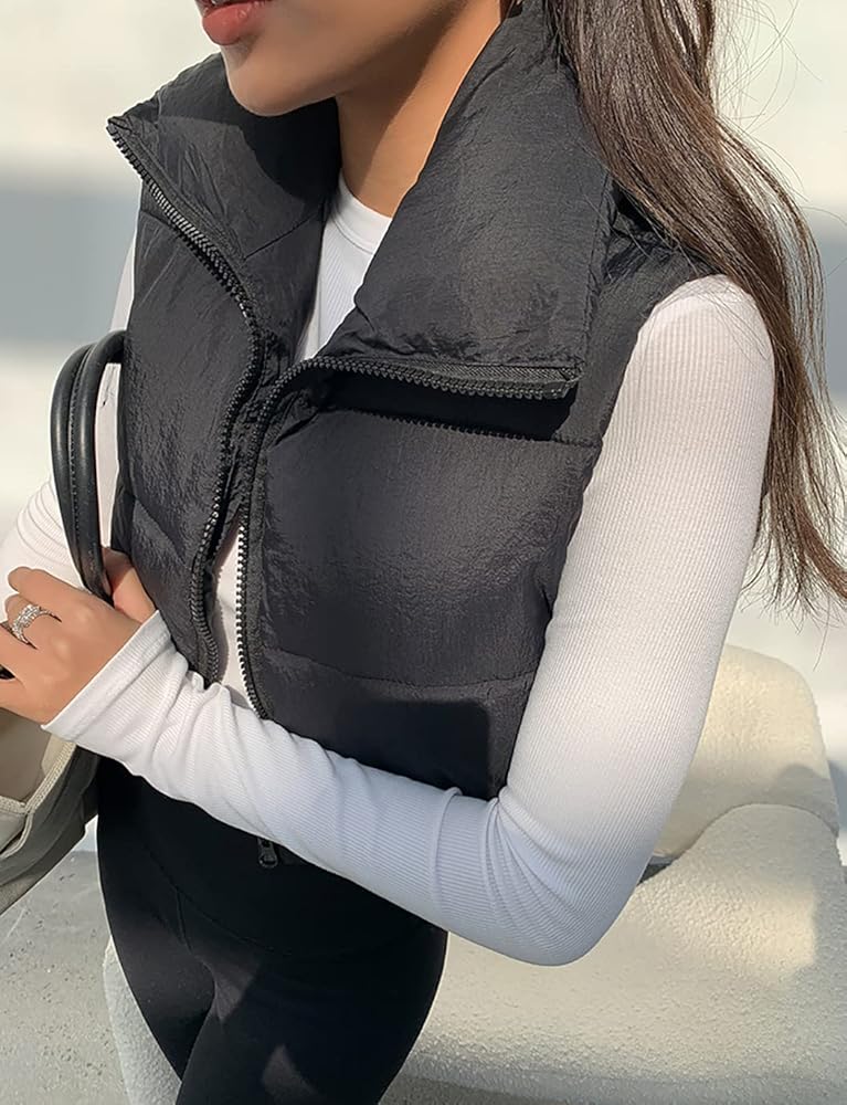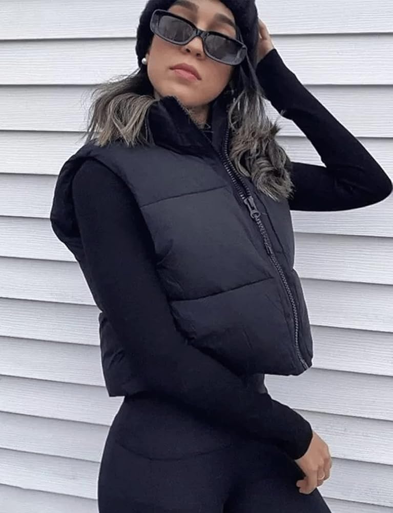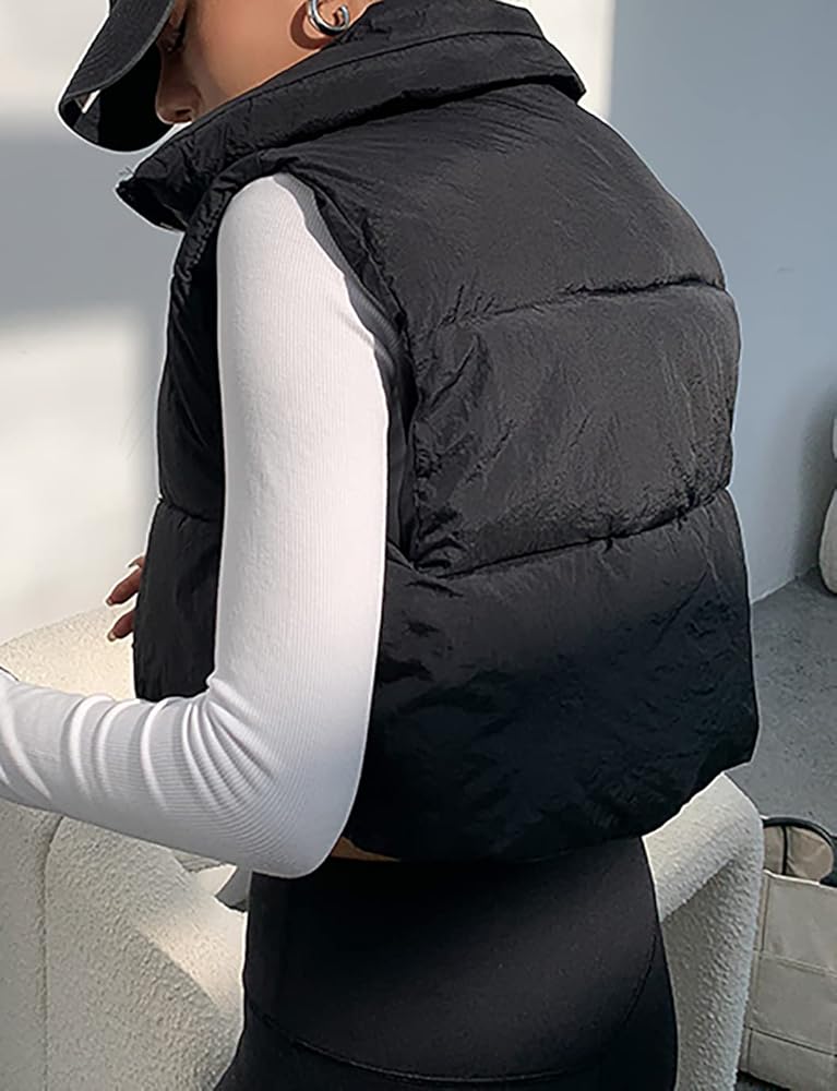 - السمات: سترة نسائية شتوية قصيرة، ياقة واقفة، بدون أكمام، حاشية برباط مرنة وقابلة للتعديل، سحاب كامل