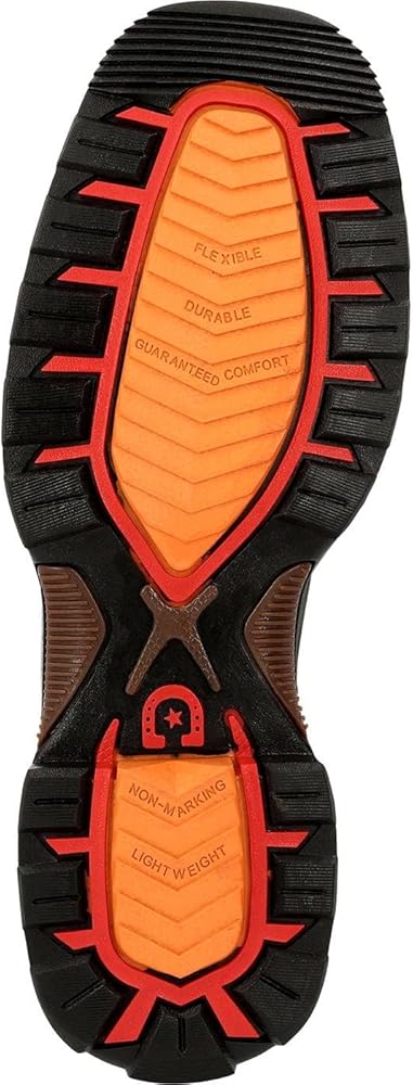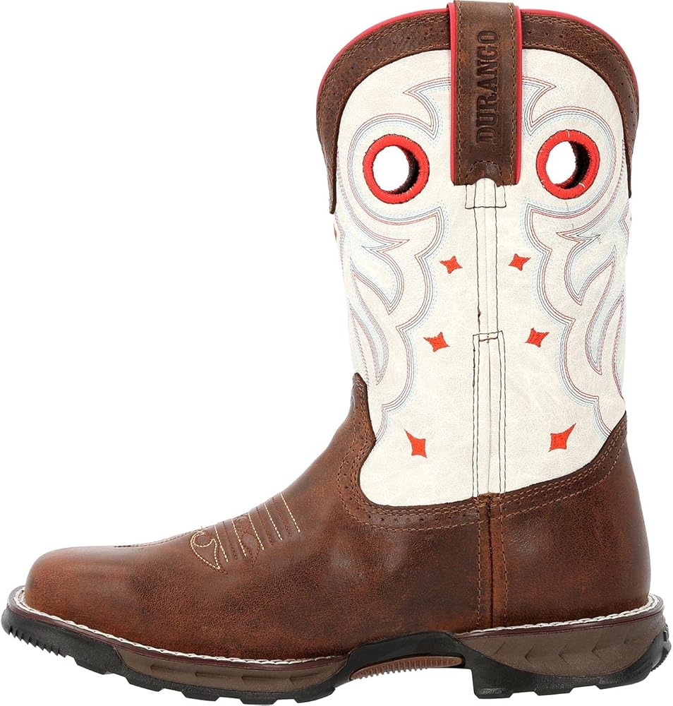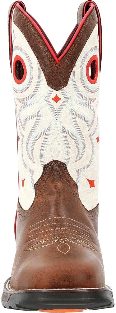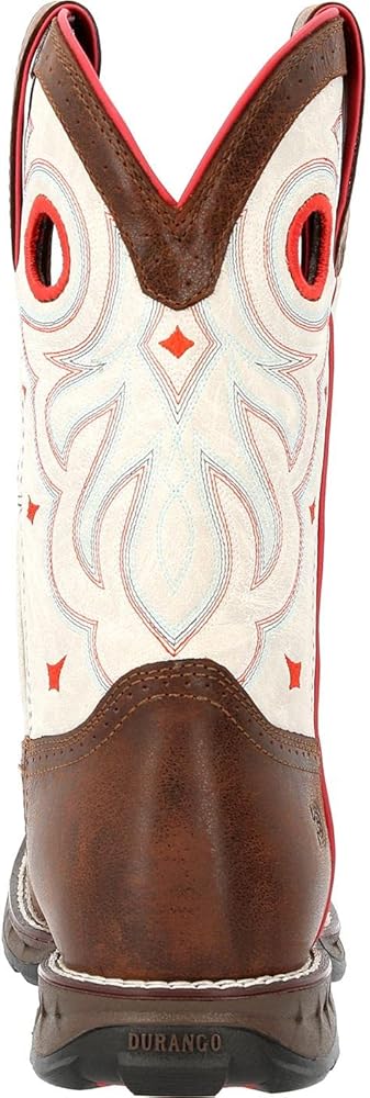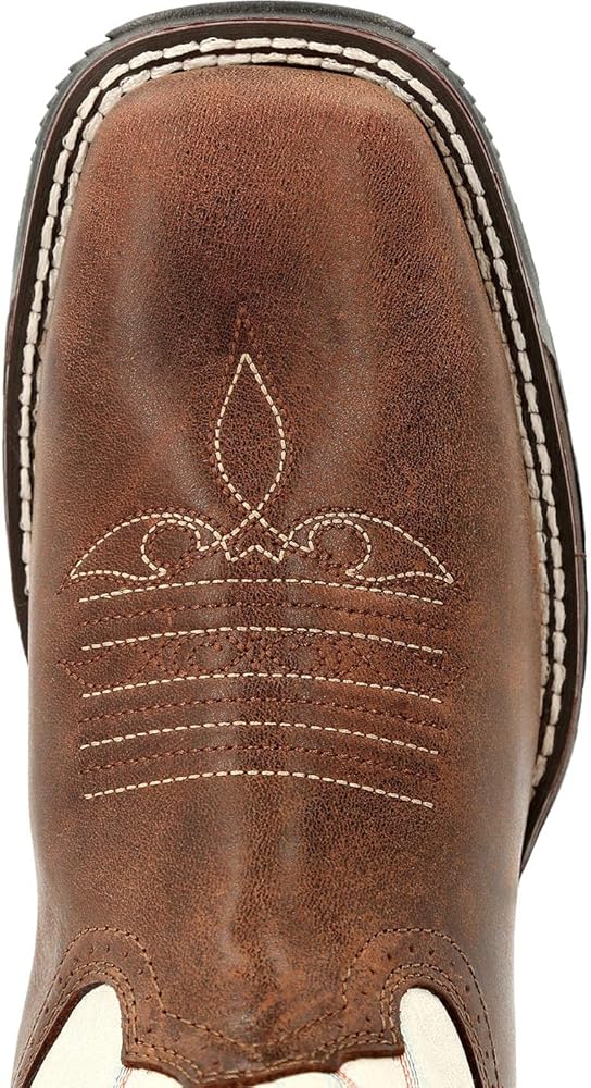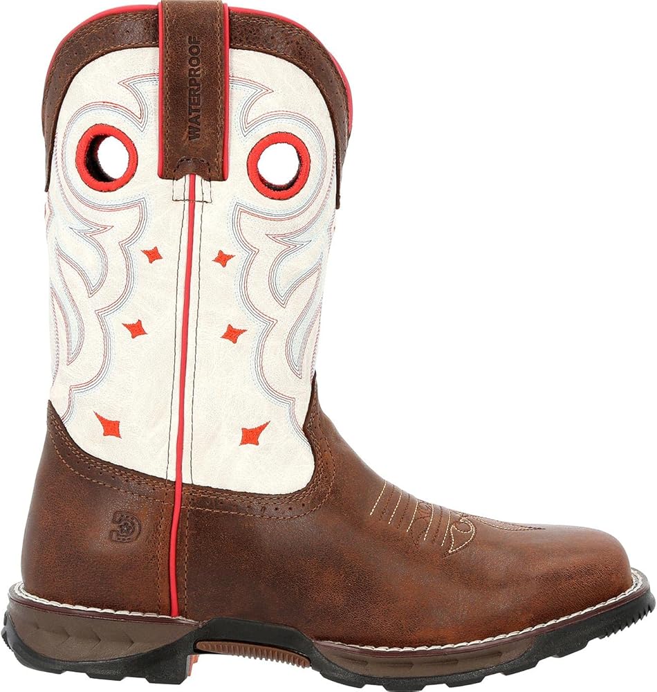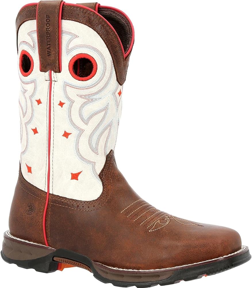 Introducing the women's Durango Maverick Steel Toe Waterproof Western Western Work Boot in Sable Brown/White. This women's 10-inch protective toe style has a full-grain leather foot with a faux shaft, soft mesh lining and waterproof membrane bootie construction. And features the Durango X-Pand System, which is a hidden gore expansion for universal fit and easy on/off. Approved to the ASTM standards, these boots have a steel toe cap within the square toe and are electrical hazard resisting. This style also includes the Durango X-Treme Comfort Footbed with memory foam for all day comfort and support, a fiberglass shank for stability and a rolled shank area allows easy placement in the stirrup. The style is finished off with a slip- and oil-resisting rubber outsole, single row sole stitch, 1 1/8-inch rocker heel. Pull on all-day work comfort in this women's 10-inch Western Waterproof Sable Brown/White Steel Toe Durango Maverick. Get a pair today!