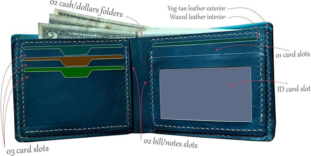 • هيكل بسيط: تحتوي المحفظة الجلدية الرجالية المصنوعة يدويًا على 06 فتحة للبطاقات، و02 حافظة كبيرة للنقود، و02 طيات متوسطة للفواتير/الملاحظات. إنها محفظة بسيطة، نحيفة ورفيعة، تناسب الجيب الأمامي ولكنها توفر مساحة كافية لاستخدامك اليومي.
