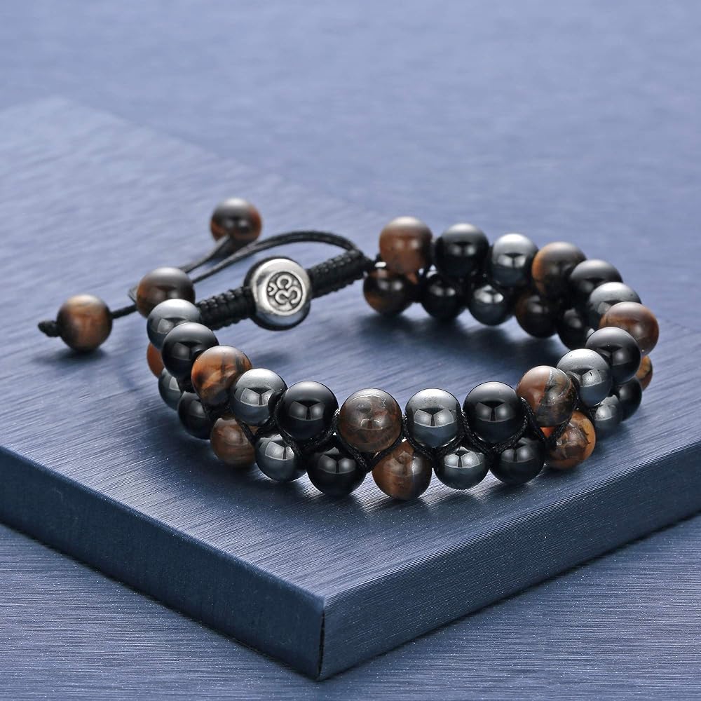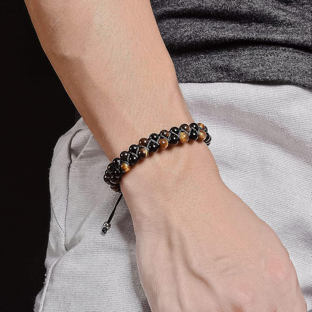 [حجم قابل للتعديل]: أساور الخرز الرجالية هذه مع خيط قابل للتعديل، الطول الداخلي 7.5-7.9 قدم، جنبًا إلى جنب مع طبقتين من الخرز بقطر 8 مم، مناسبة لكل من الرجال والنساء