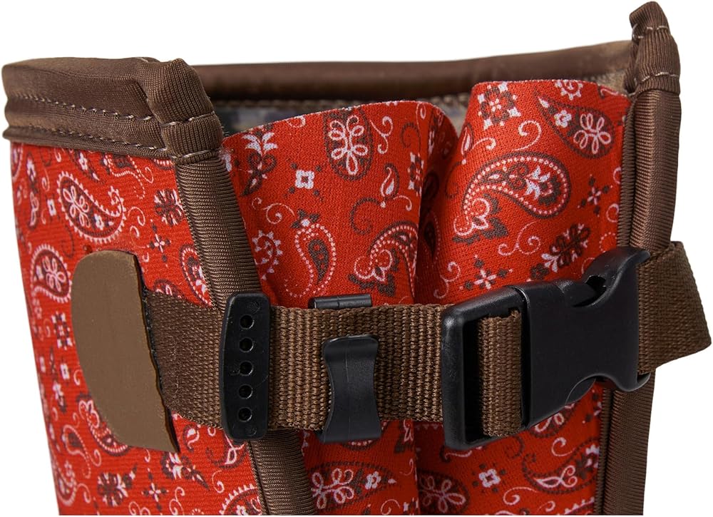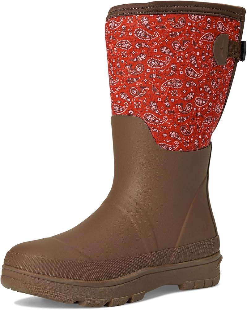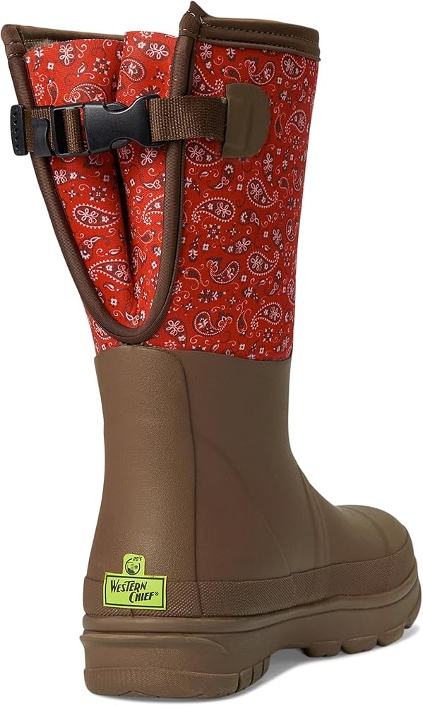 Introducing the Western Chief Neoprene Wide Calf Tall Cold Weather Boot - your go-to choice for all-weather protection and style. Constructed with high-quality waterproof rubber and neoprene upper, these boots provide insulation with a 5 mm neoprene and faux fur lining. Enjoy ultimate comfort with the cozy memory foam insole featuring faux fur for cushioned support. The durable rubber lug outsole ensures traction and stability, offering a secure grip in cold conditions. Tailor your fit with the adjustable back gusset and buckle, adding a touch of customization to your stylish look. Equipped with cold-rated WarmBuilt technology and a -20 degree cold rating, these boots guarantee warmth in chilly weather. Choose the bandana neoprene faux fur wide calf tall cold weather boot for a perfect blend of fashion and functionality. Knee-high silhouette. Back pull tab for easy wear. Round toe design.