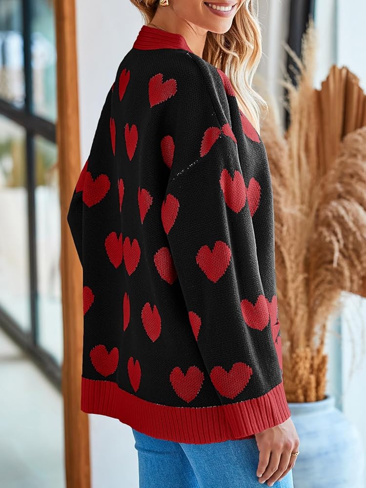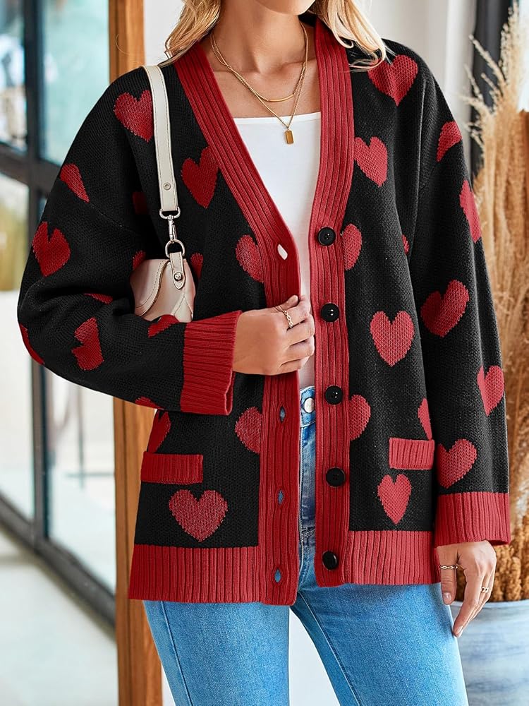 المميزات: طباعة قلب، كم طويل، جيبين، كتلة ألوان مع زخرفة متباينة، رقبة على شكل حرف V وزر سفلي للإغلاق مع ياقة شال، سترة جرافيك، سترة فضفاضة كاجوال مفتوحة من الأمام للنساء، سترات سفلية بأزرار سفلية للنساء سترة صوفية محبوكة مع جيوب