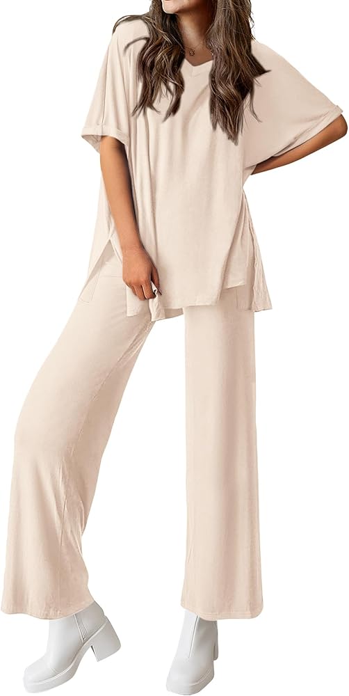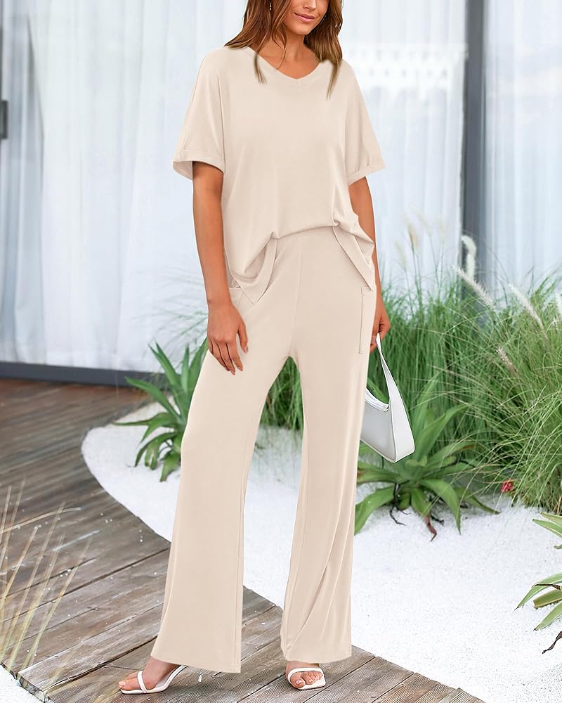 السمات: S=الولايات المتحدة 4-6، M=الولايات المتحدة 8-10، L=الولايات المتحدة 12-14، XL=الولايات المتحدة 16؛ ملابس صيفية مكونة من قطعتين؛ بلايز نصف كم؛ بلوزة برقبة على شكل حرف V؛ بلوفر ذو فتحة عالية ومنخفضة؛ سروال بخصر مطاطي مع جيوب؛ مجموعات بانت واسعة الساق؛ طقم صالة من قطعتين للنساء