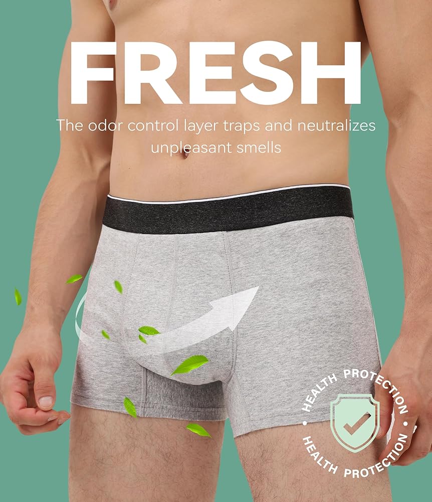 امتصاص سريع: تحتوي هذه الملابس الداخلية على طبقة ماصة تمتص الرطوبة بسرعة لتبقيك جافًا ومرتاحًا أثناء أي نشاط. مع قدرتها على استيعاب ما يصل إلى 60 مل، فهي مثالية لسلس البول الخفيف إلى المتوسط