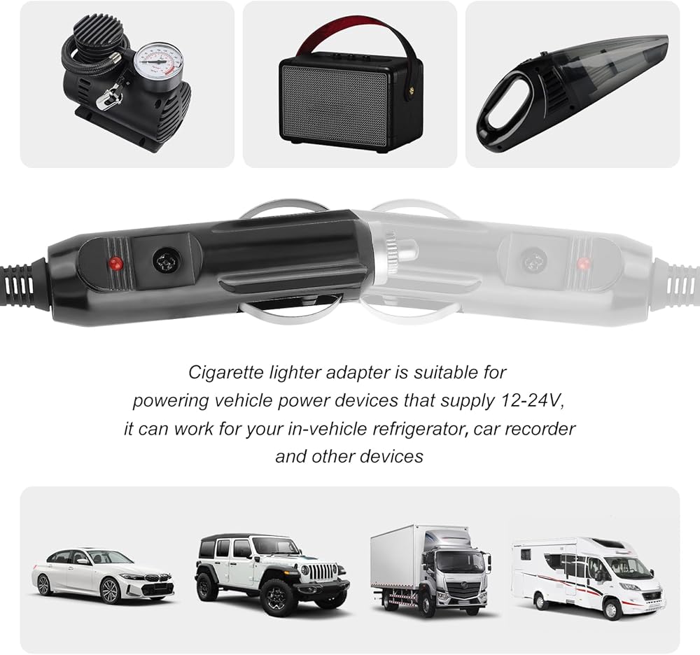 Wide Application: Cigarette lighter adapter is suitable for powering vehicle power devices that supply 12-24V, such as cars, trucks, SUVs, motorhomes, vans, motorcycles, ATVs. It can work for your in-vehicle refrigerator, car recorder and other devices