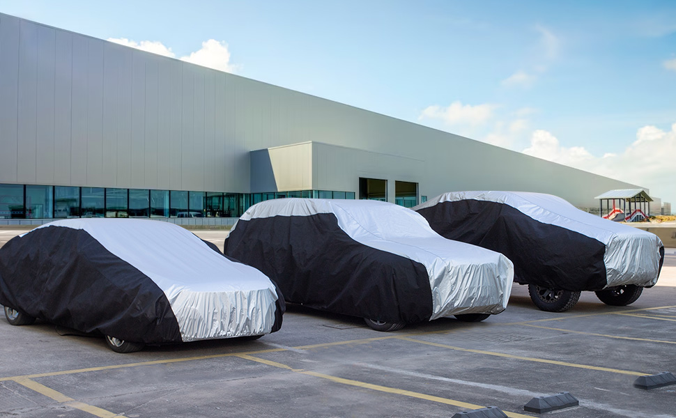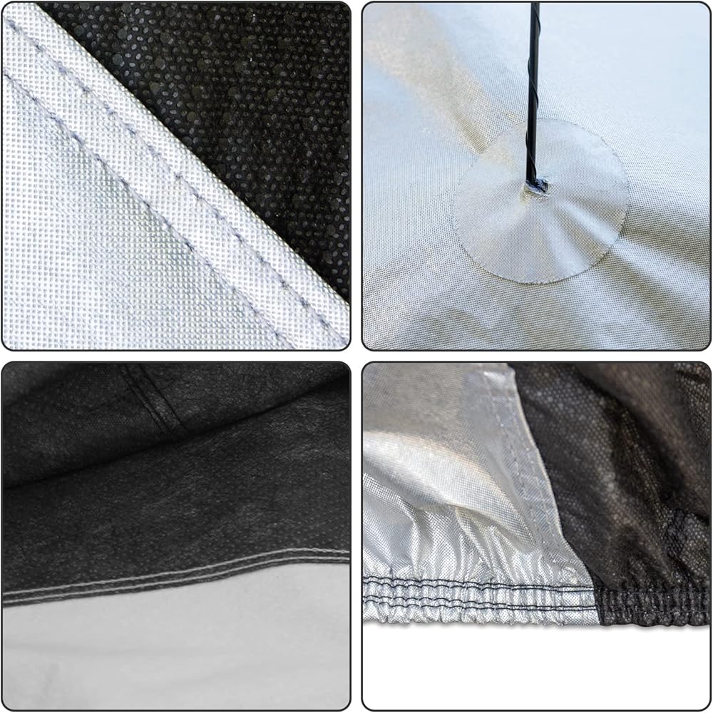 【حماية ممتازة】القماش العلوي مصنوع من الألومنيوم والصوف القطني، مما يعكس ضوء الشمس ويحافظ على برودة سيارتك. يسمح النسيج الأسود المسامي بالتهوية المناسبة. لقد اجتاز غطاء السيارة الخاص بنا أيضًا اختبارات مختبر SGS للمعالجة بالأشعة فوق البنفسجية، مما يضمن الاستخدام لفترة أطول.