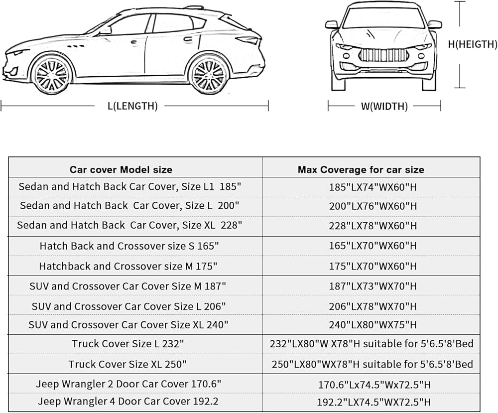 【اختر المقاس المناسب】إذا كانت سيارتك تحتوي على ميزات إضافية مثل المصدات أو الأسطح أو الإطارات الاحتياطية، فاختر مقاسًا كبيرًا جدًا لملاءمة أفضل. إذا كان حجم سيارتك قريبًا من الحد الأقصى لحجم الغطاء، فنوصي باختيار مقاس كبير جدًا.