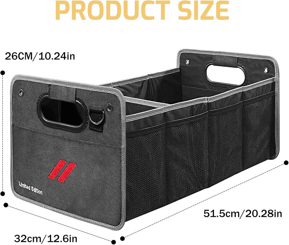 • 【مساحة تخزين أكبر】يستخدم منظم صندوق السيارة الخاص بنا تصميمًا مكونًا من مقصورتين. البعد الممتد بالكامل هو 20.27 بوصة طول × 12.59 بوصة عرض × 10.23 بوصة ارتفاع. أربعة جيوب جانبية وحقيبة شبكية واحدة وحجرتين كبيرتين يمكنها حمل العديد من العناصر المختلفة. ويضمن التصميم المضاد للانزلاق في الأسفل بقاء الحمولة آمنة دون انزلاق