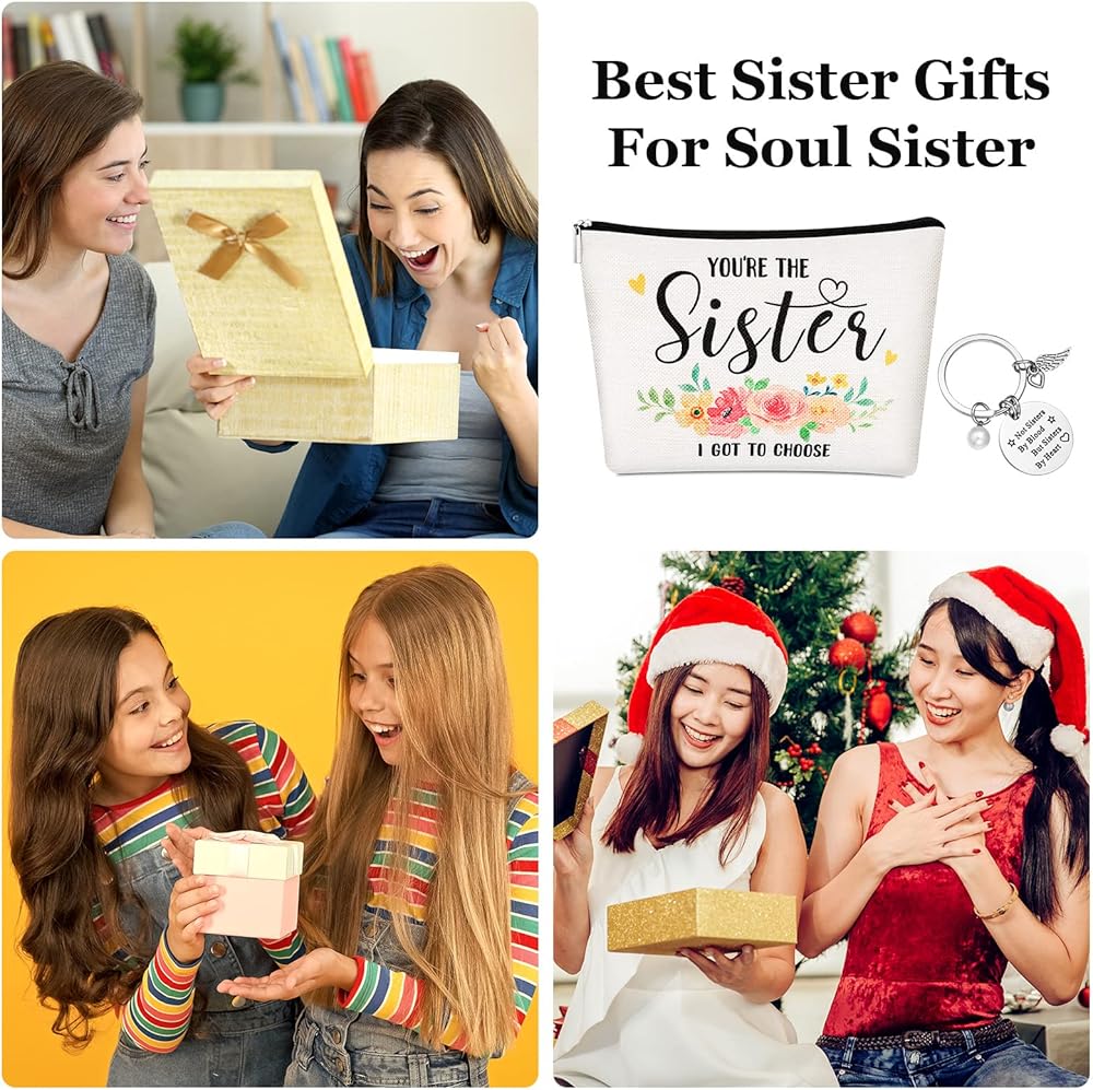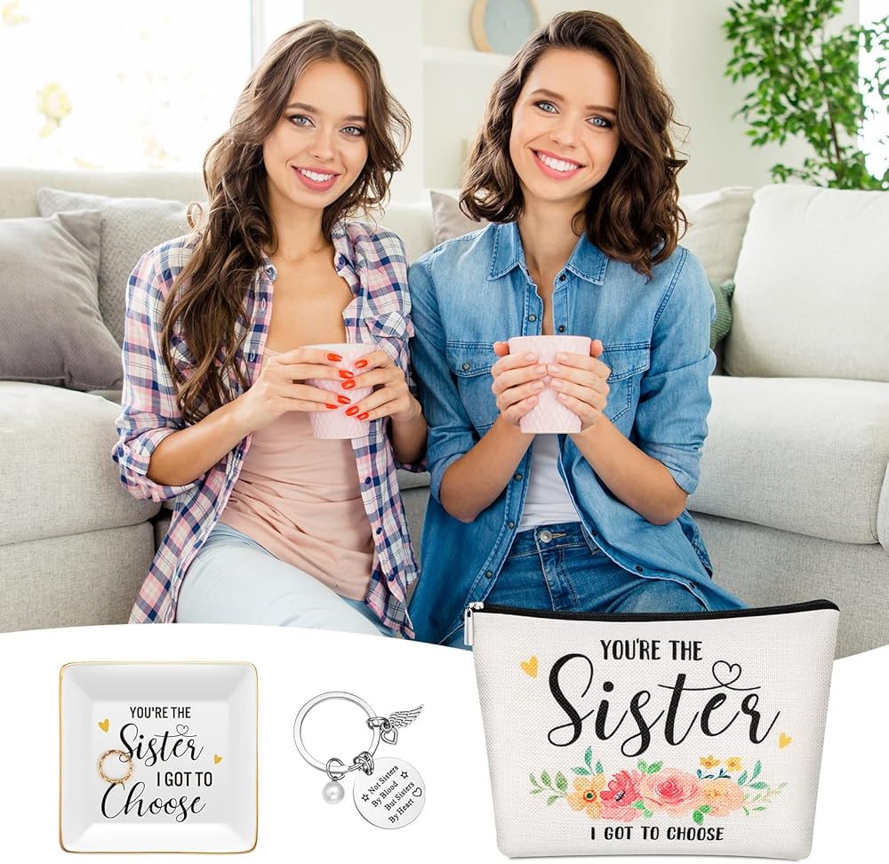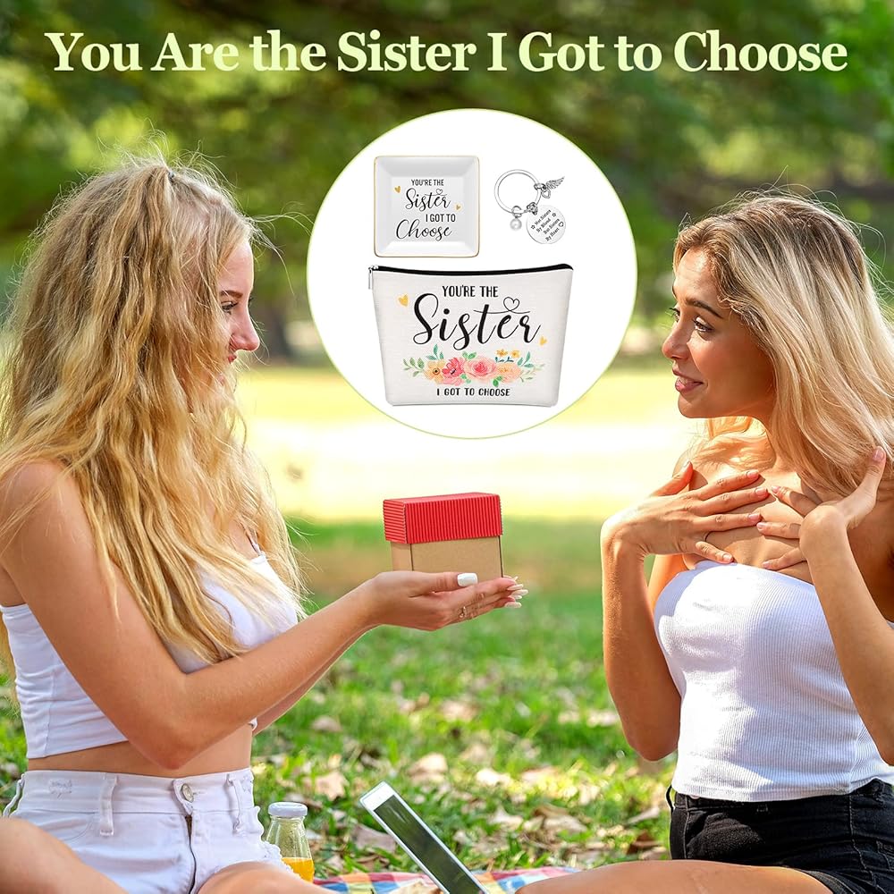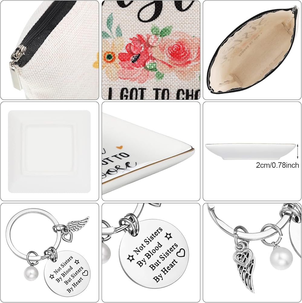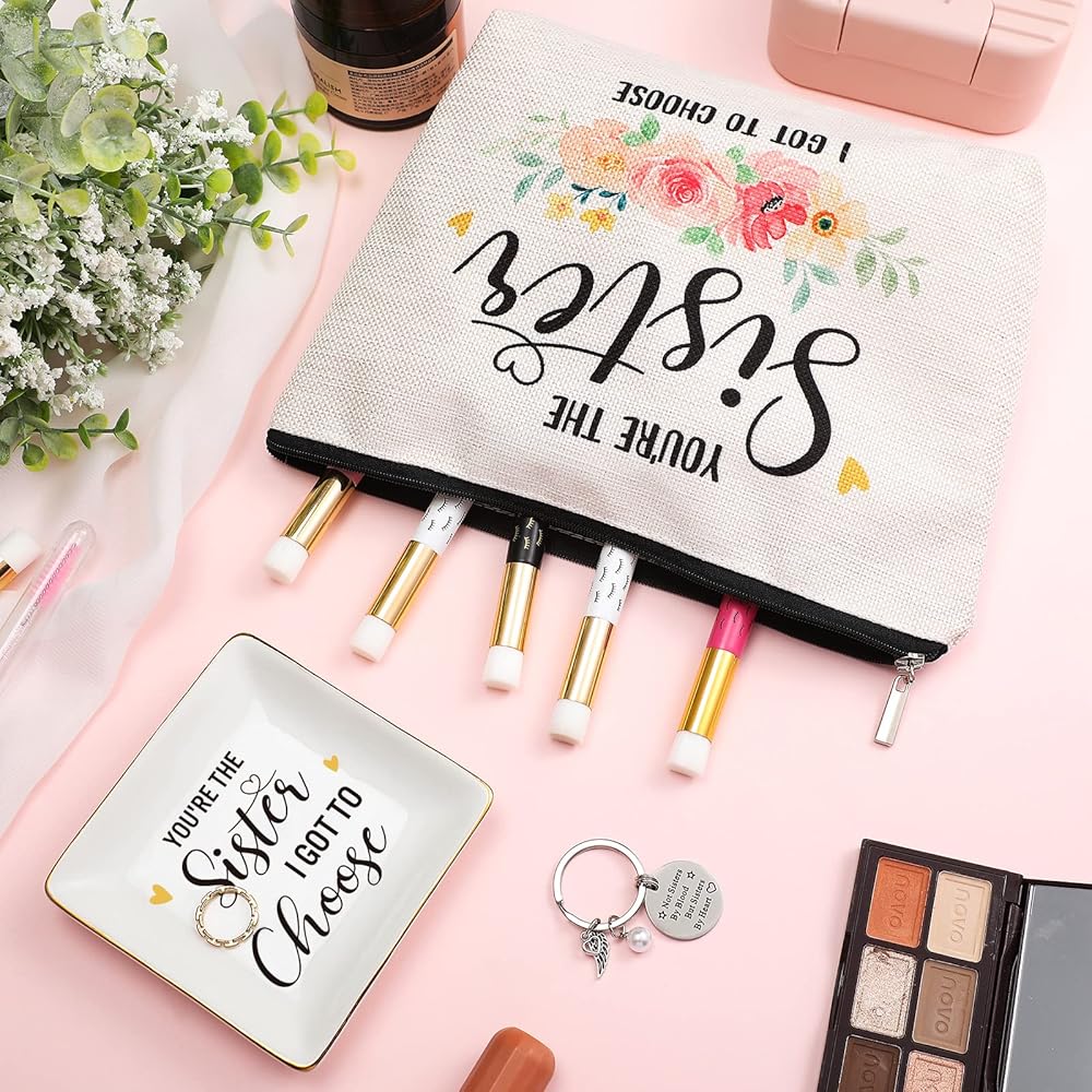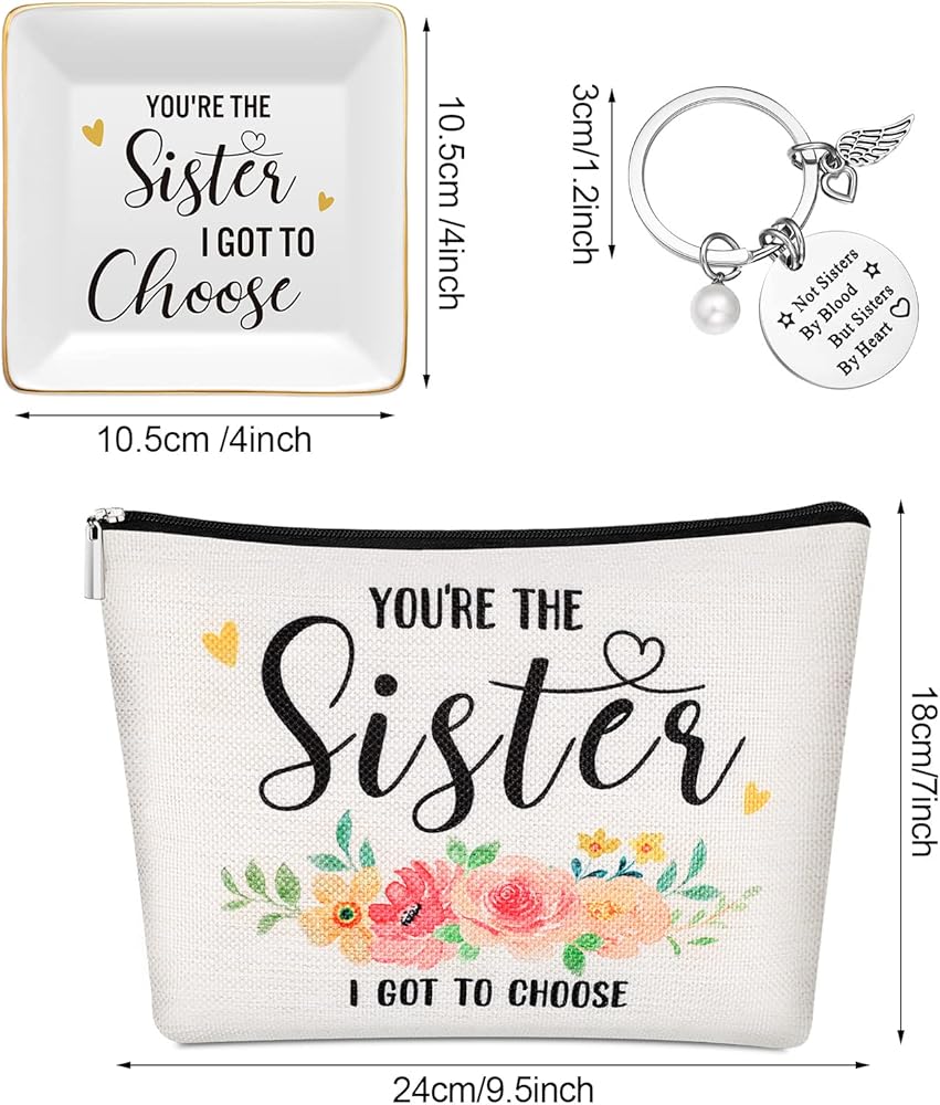 The sister trinket dish measures about 10.5 x 10.5 x 2 cm/ 4.13 x 4.13 x 0.79 inches, the sister makeup bag measures about 24 x 18 cm/ 9.45 x 7.09 inches, and the ring of sisters keychain is about 3 cm/ 1.18 inches in diameter, proper for you to use.
