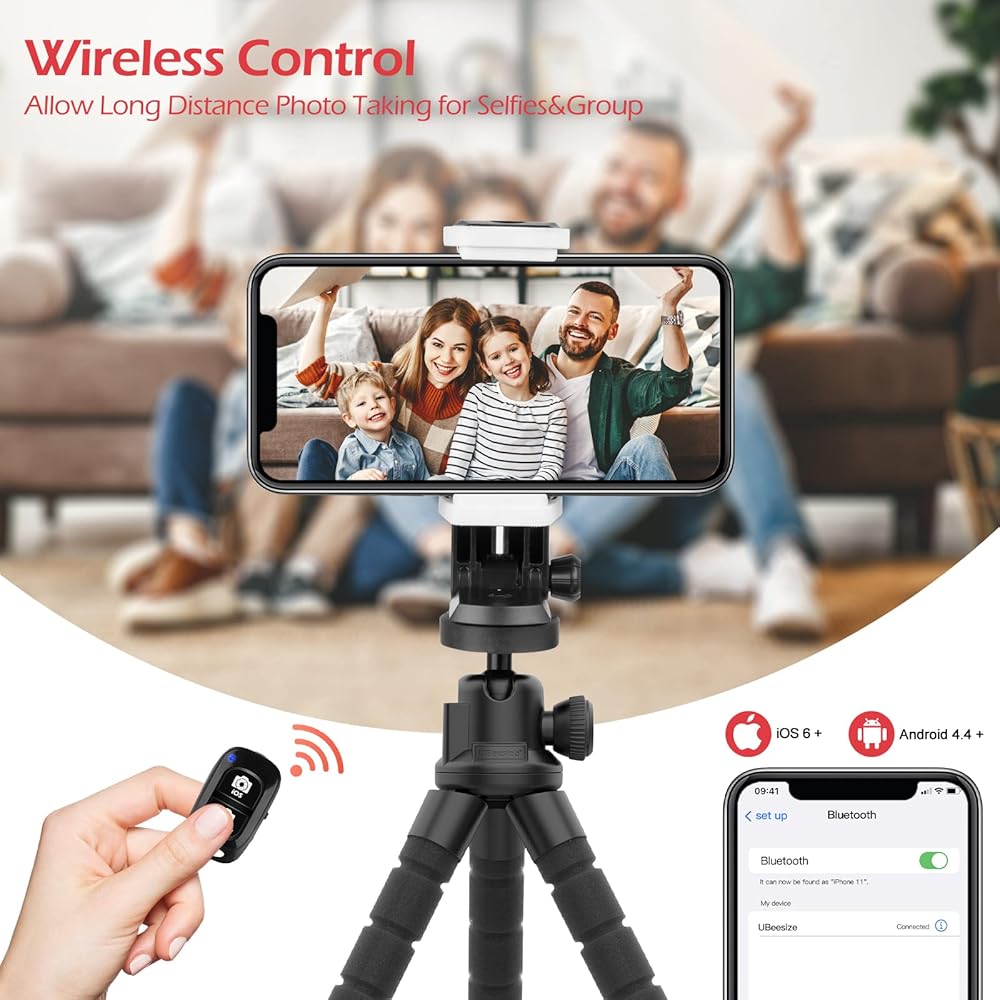 • 【منفذ وملحقات وظيفية】 يأتي مع حامل هاتف عالمي مطور (يعمل مع الهواتف المحمولة التي يصل عرضها إلى 5.23 بوصة، وجهاز تحكم عن بعد لاسلكي يعمل بالبلوتوث (متوافق مع معظم الهواتف المحمولة وأجهزة التحكم حتى مسافة 30 قدمًا). بواسطة خيط برغي محول قياسي، فهو متوافق مع الكاميرات الرقمية وGoPro.