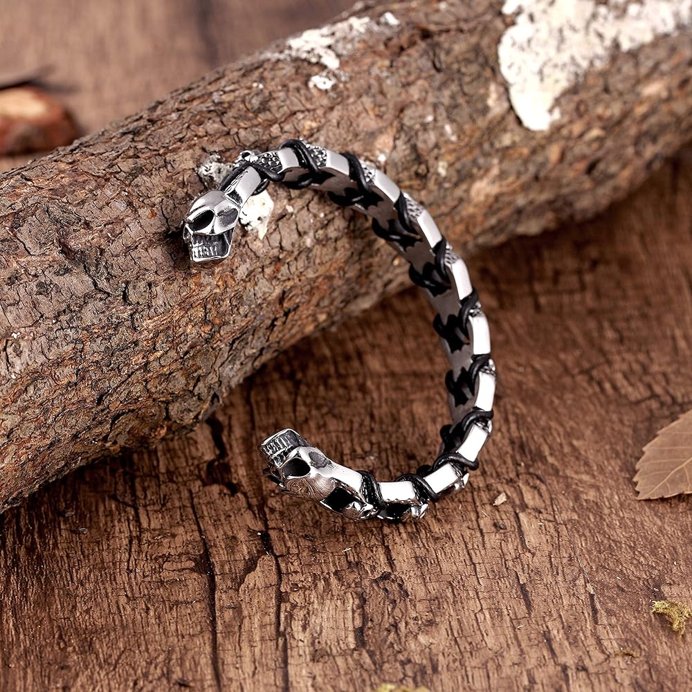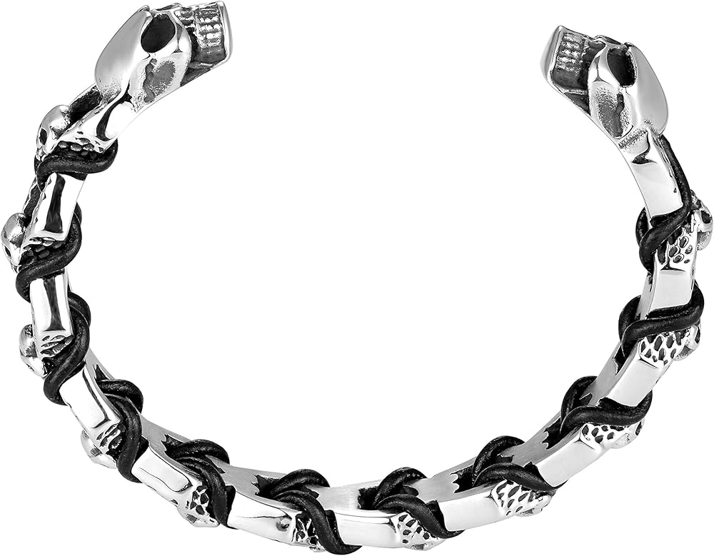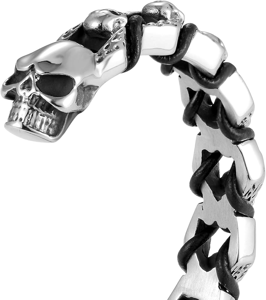 ✔ جمجمة الموت في النهاية - سوار سلسلة كبح بلمسة نهائية فضية مصقولة مع غطاء جمجمة الموت في كل طرف. مفصلة مع عروق جلدية سوداء متشابكة. رمز جريء لثبات الرجل.
