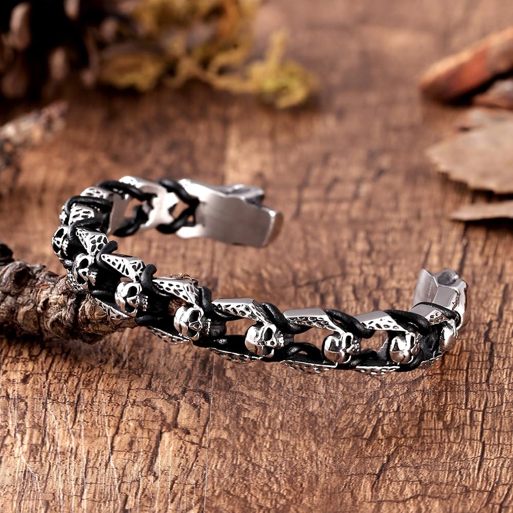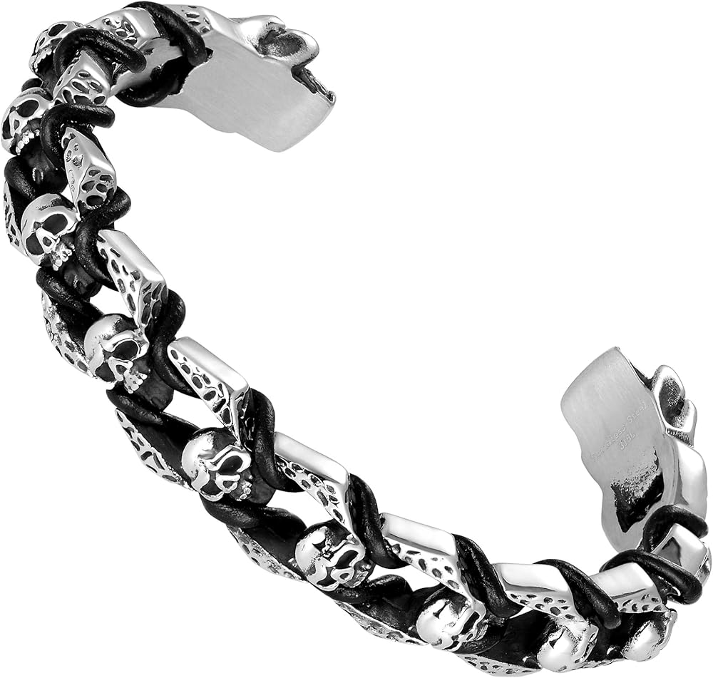 سوار Bold للرجال لراكبي الدراجات النارية - تصميم جمجمة الموت بسوار فضي مصقول - مصنوع من الفولاذ المقاوم للصدأ المقاوم للصدأ وتغير اللون مع تفاصيل من الجلد الطبيعي الأسود - هدية مجوهرات للرجال
