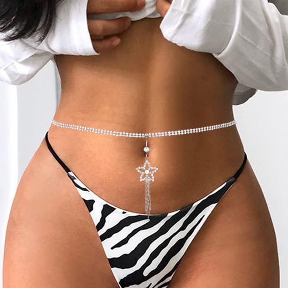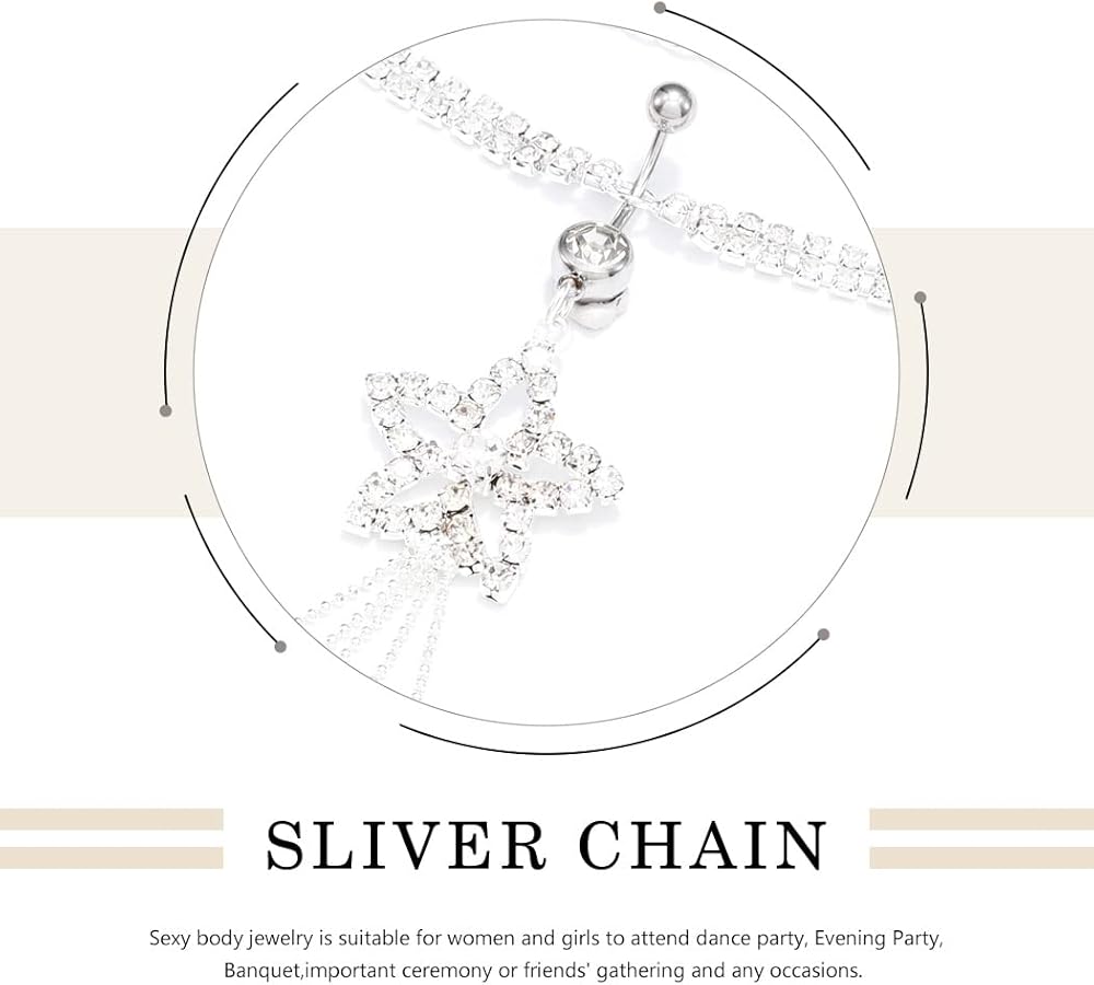 Asooll الفضة كريستال البطن زر الدائري مع سلسلة أحجار الراين الخصر الجسم سلسلة بيكيني البطن مجوهرات الأزياء الشاطئ الهذيان حزب الجسم اكسسوارات مجوهرات للنساء