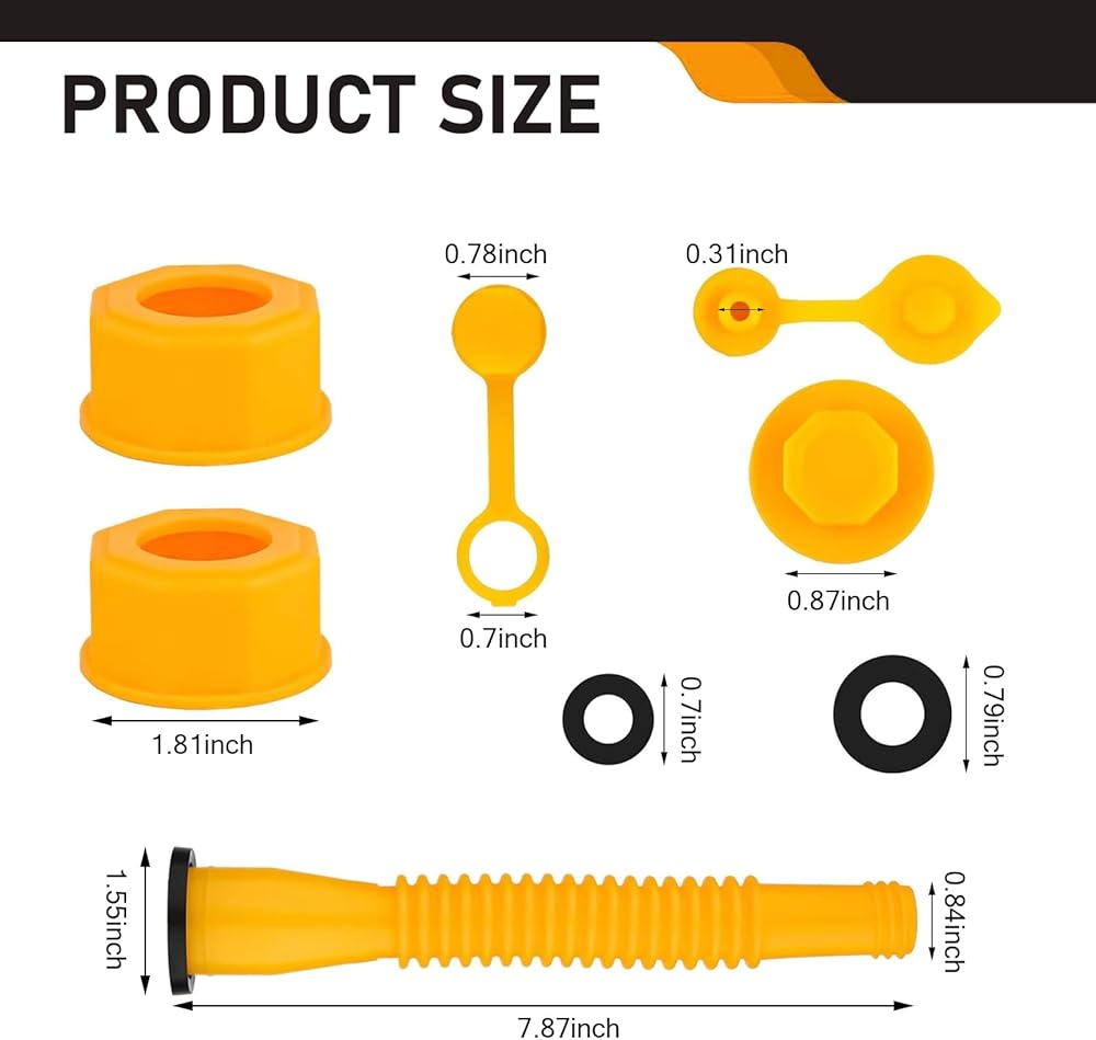 Package Included: Package includes 1 x fuel gas can tank nozzle, 7.8" in length, 0.84" in threaded interface diameter. Also comes with other fittings, 3 x hex nut plugs with inner diameters of 0.87" and 1.81" (one coarse thread, one fine thread). 2 x rubber washers with outer ring diameters of 0.79" and 0.7". 2 x nozzle caps, 0.78" and 0.31". The hexagonal screw cap can control the flow of liquid, and it has an excellent anti-overflow design.