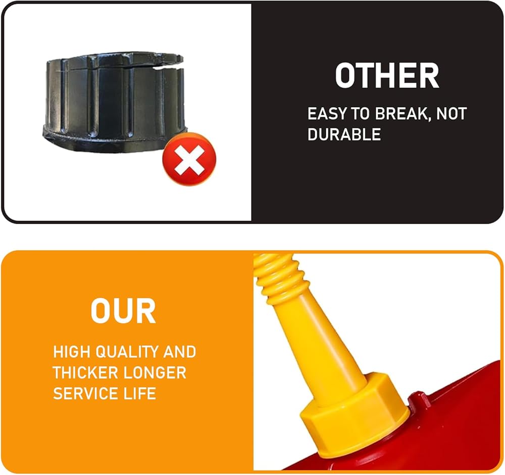 Function: When you use the gas can to refuel the car, you don't have to worry about the fuel spilling. Different sizes of nut plugs are suitable for different gallon tanks. The outlet is sealed and when you pick up the gas tank, there is no need to spill fuel and avoid staining your clothes or car. At the same time, the flow rate of liquid is greatly increased, and the tank can be emptied quickly. Provides more stability when refueling the car.