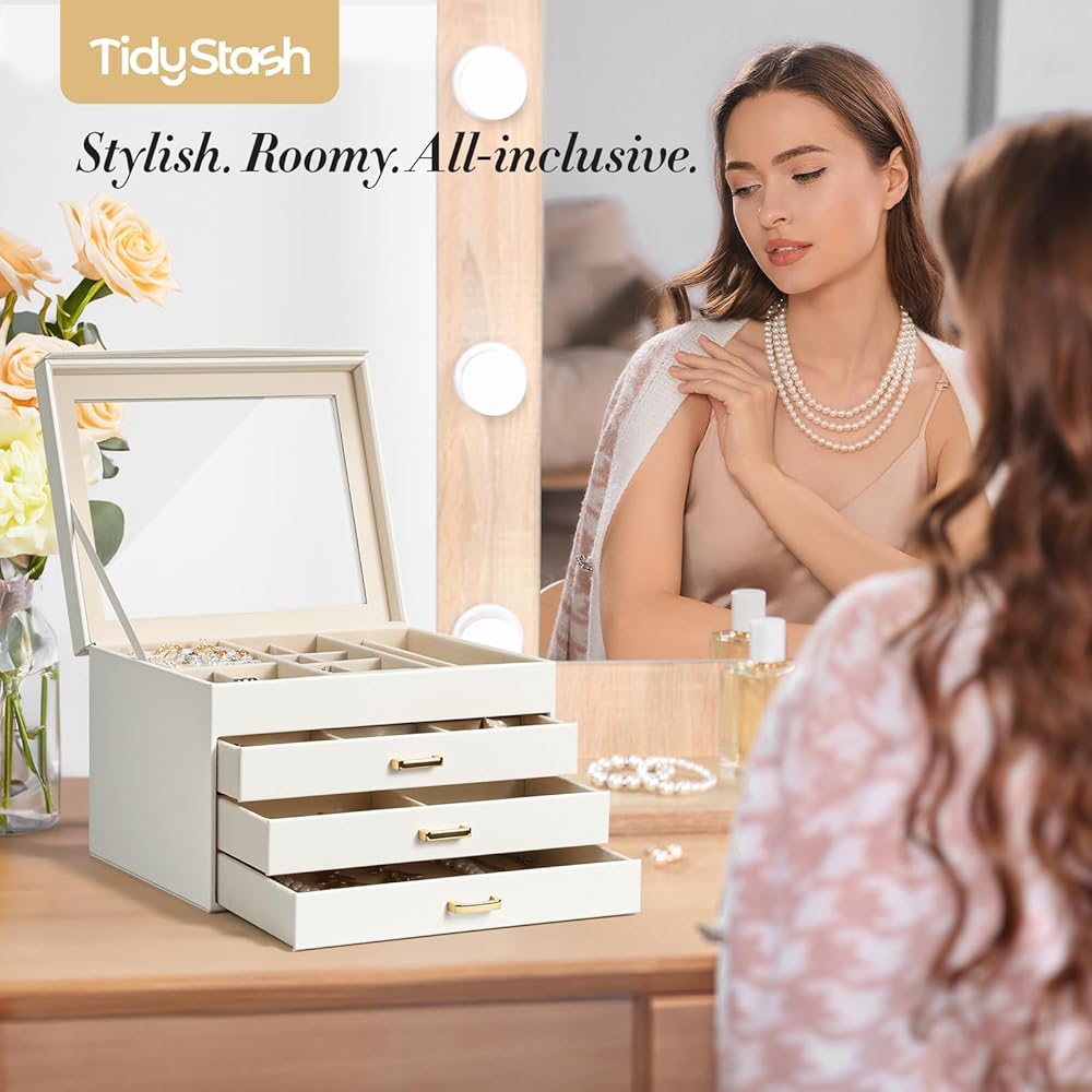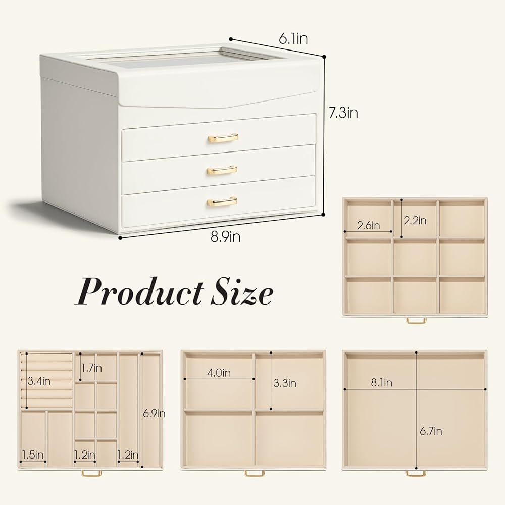 Elegant Design and Aesthetic Appeal: The jewelry box boasts a sleek, modern appearance with a classic, understated charm. Its aesthetic, highlighted by a glass top, gold handles, and cream faux leather, exudes sophistication and fits seamlessly with any décor. This chic design ensures it looks stunning on any vanity or dresser