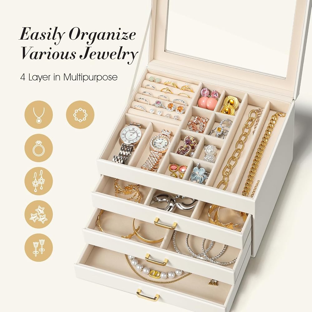 Compact and Spacious Storage: Featuring a thoughtfully organized 4-layer design, this jewelry box offers surprisingly generous storage without being bulky. It includes dedicated slots and compartments for your jewelry, from rings and earrings to necklaces and bracelets, making everything remains tidy, accessible, and tangle-free