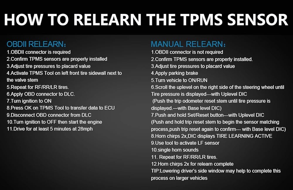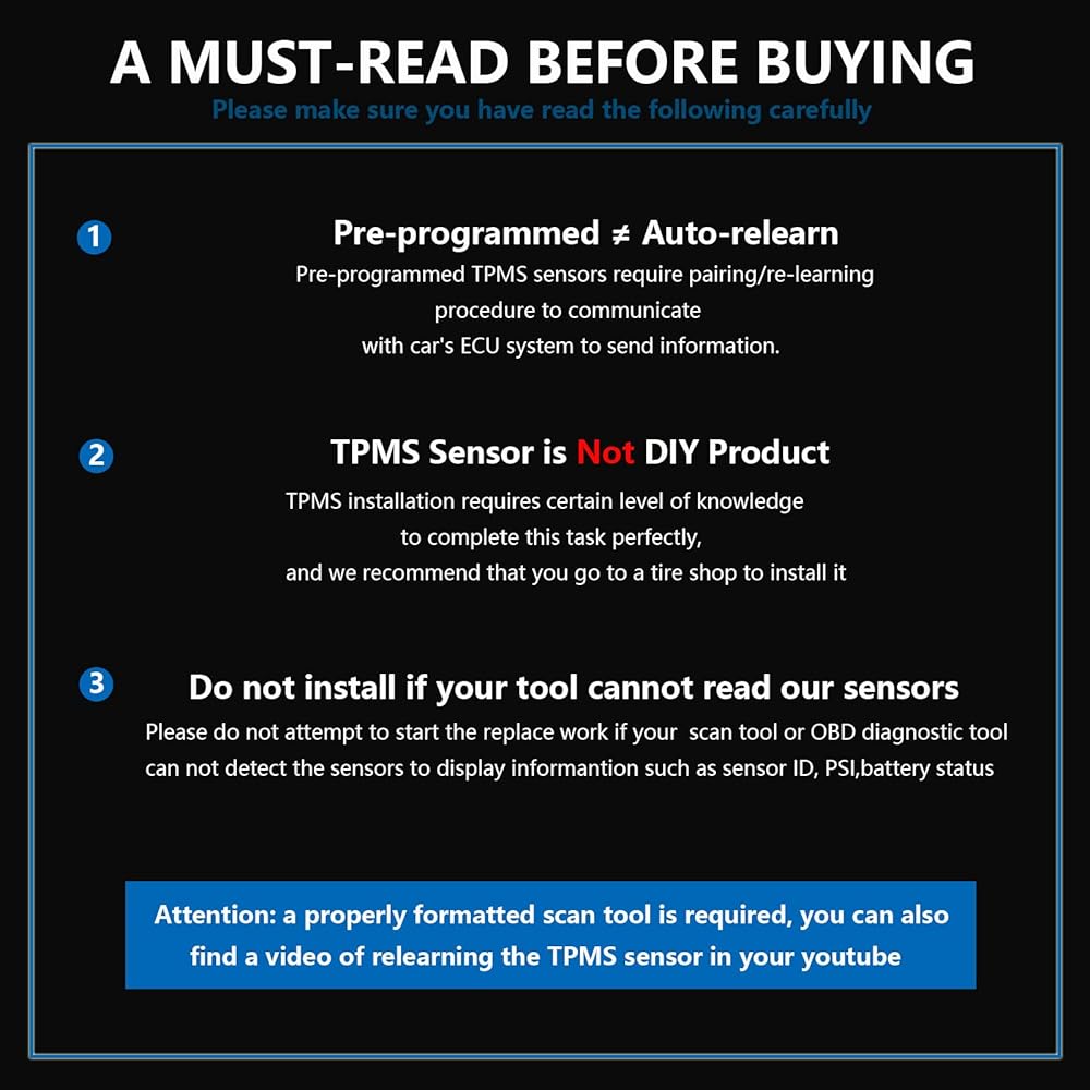 [ Warm Note] -- Please note: A TPMS Relearn is required after install.Please confirm the year and model of the vehicle,if you have any doubt or problems ,please feel free to contact us, we will try our best for your satisfaction