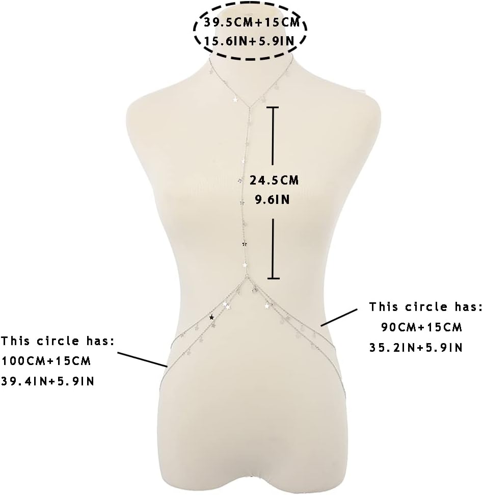 حجم سلسلة الجسم الأنيقة: محيط الرقبة 65 سم + 15 سم (25.61 بوصة + 5.91 بوصة)، محيط الخصر 82 سم + 15 سم (32.31 بوصة + 5.91 بوصة).