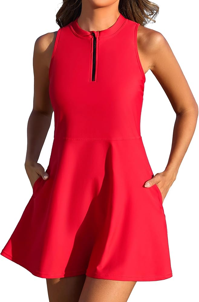 جيبان جانبيان: فستان السباحة مصمم بجيبين جانبيين لتخزين الهاتف والبطاقات والمفاتيح وغيرها من الضروريات الصغيرة بشكل مريح، مما يحافظ على يديك حرتين