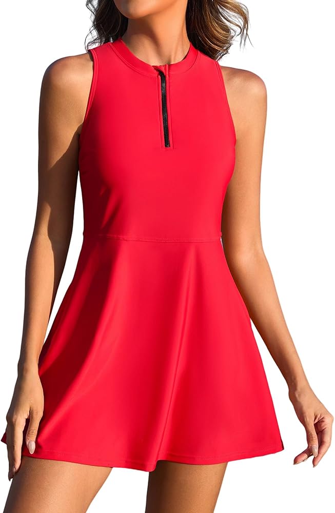 سحاب أمامي: فستان السباحة مصمم بسحاب إغلاق يجعل من السهل ارتداؤه وخلعه. وتتميز ملابس السباحة ذات الرقبة العالية بحمالة صدر مبطنة مدمجة توفر دعمًا ممتازًا