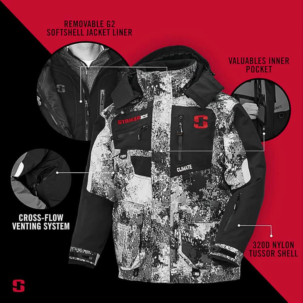 • 3-in-1 Jacket System: Built to withstand changing climate conditions, the Climate Jacket from Striker is a great outdoor and ice fishing accessory that provides quality comfort in any temperature. The 3-in-1 jacket system with a removable 60g PrimaLoft Black insulated Adapt Insulated Jacket provides full season versatility and complete customization to changing weather. Wear each jacket on its own, or together for the ultimate cold-weather outerwear.