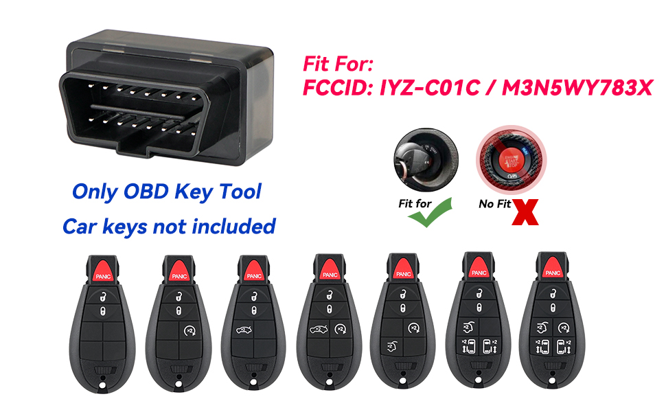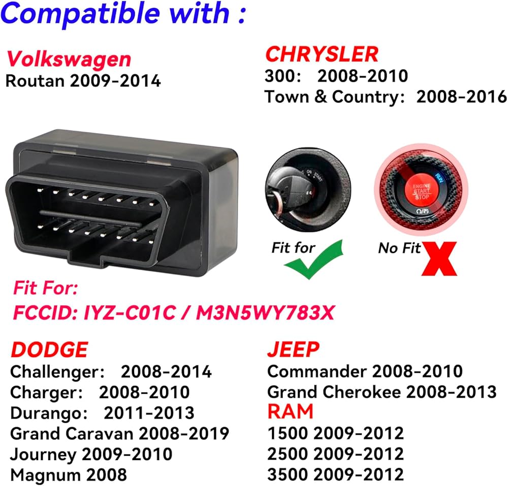 لأداة Obd لمفتاح Town and Country من Chrysler مناسبة لمعرف FCC: IYZ-C01C / M3N5WY783X. يرجى التحقق من صفحة التفاصيل للحصول على القائمة الكاملة لنماذج السيارات المتاحة والسنة. ملاحظة: لا يدعم المركبات ذات زر التشغيل بالضغط، فهو يدعم الإشعال بنظام التشغيل المفتاح ونظام الدخول القياسي بدون مفتاح فقط.