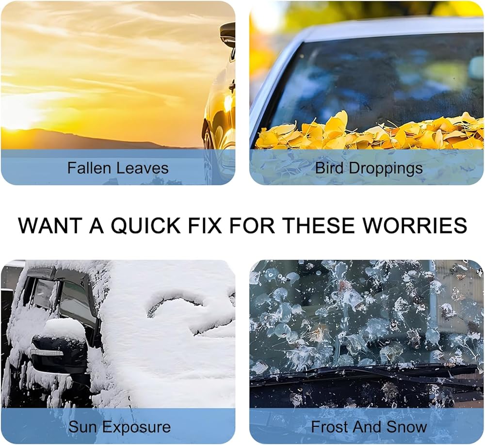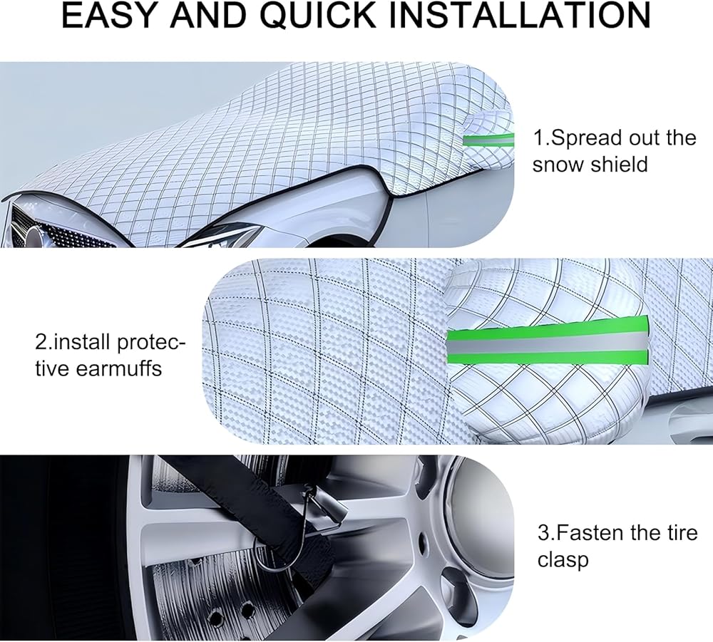 Easy to Use: This car cover is easy to use. Just spread the snow shield, install the protective earmuffs and finally buckle the tire clip. It is small in size, easy to fold and does not take up space, which is convenient for storage.