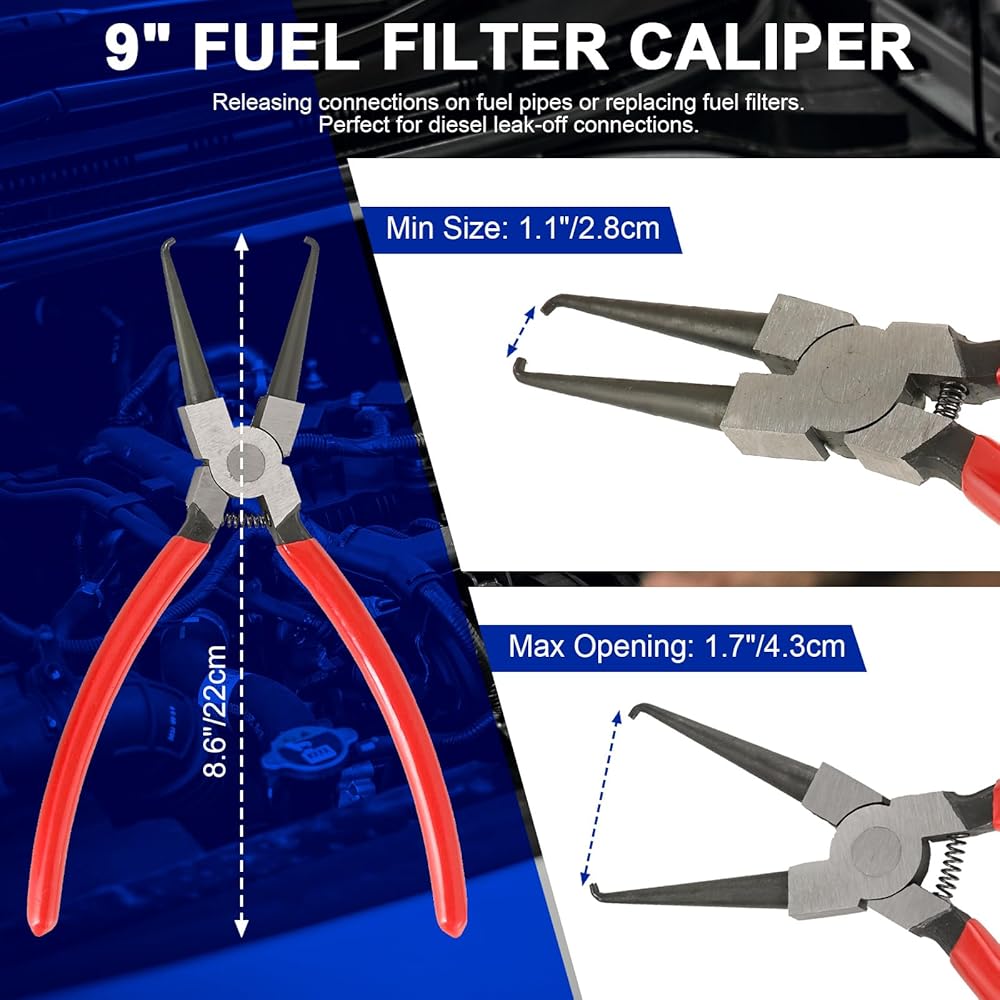 【فرجار فلتر الوقود طويل 9 بوصات】فرجار فلتر الوقود مصنوع من الفولاذ الكربوني عالي الجودة، مما يضمن المتانة والموثوقية. إنه مصمم لتحرير الوصلات بسرعة على خطوط الوقود دون التسبب في ضرر أثناء الصيانة أو استبدال مرشحات الوقود. يتميز الفرجار فكوك منحنية لسهولة إزالة واستبدال وصلات خط الوقود، وهي آلية محملة بنابض لتشغيل سهل بيد واحدة.