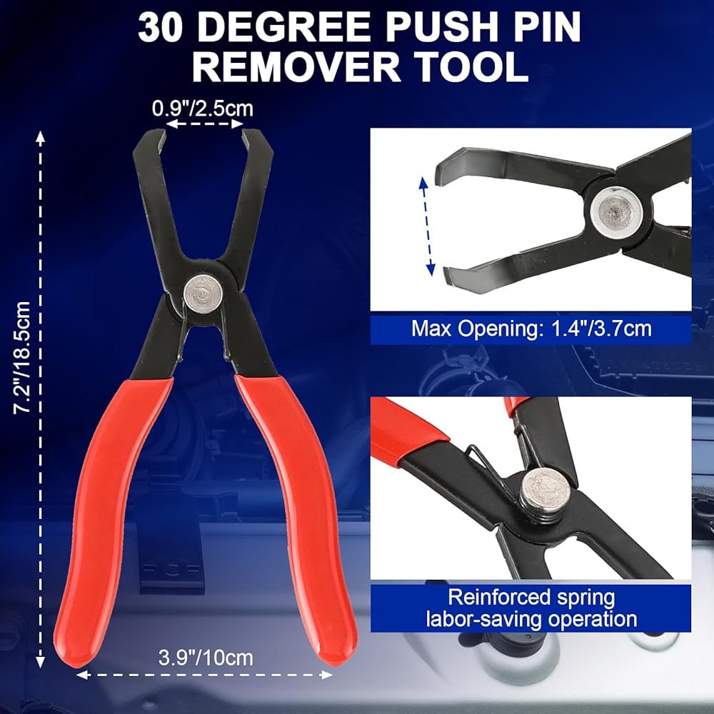 [كماشة فصل 30 درجة] تتميز كماشة الفصل بتصميم 30 درجة أكثر ملاءمة للمساحات الضيقة، مما يسمح بتفكيك وإزالة مسامير التثبيت والأبازيم المطاطية والأبازيم ذات الدبابيس المركزية مثل تلك الموجودة على ألواح الأبواب والجذع، وأجزاء الجسم الداخلية للسيارة دون إتلاف المسامير أو المثبتات. تمكنها الفكوك المنحنية من الوصول بسرعة إلى المساحات الضيقة وفصل المقابس الصلبة القديمة وتركيبات خط الوقود، مما يحمي يديك أثناء تسهيل أعمال الإصلاح.