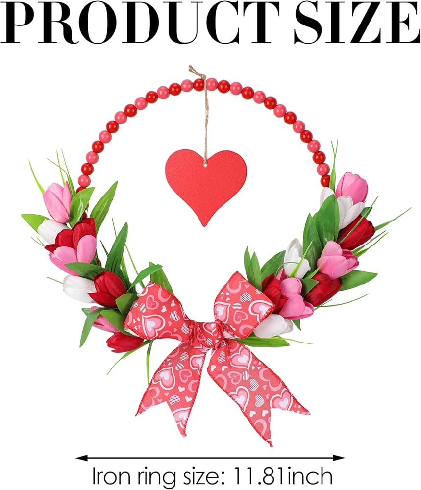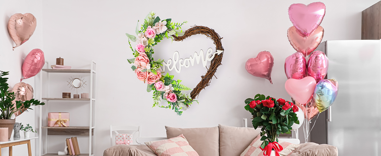 • صناعة يدوية: كل إكليل من إكليل عيد الحب مصنوع يدويًا مع الاهتمام بالتفاصيل، مما يضمن زخرفة قوية تضفي لمسة شخصية رومانسية على أي مساحة