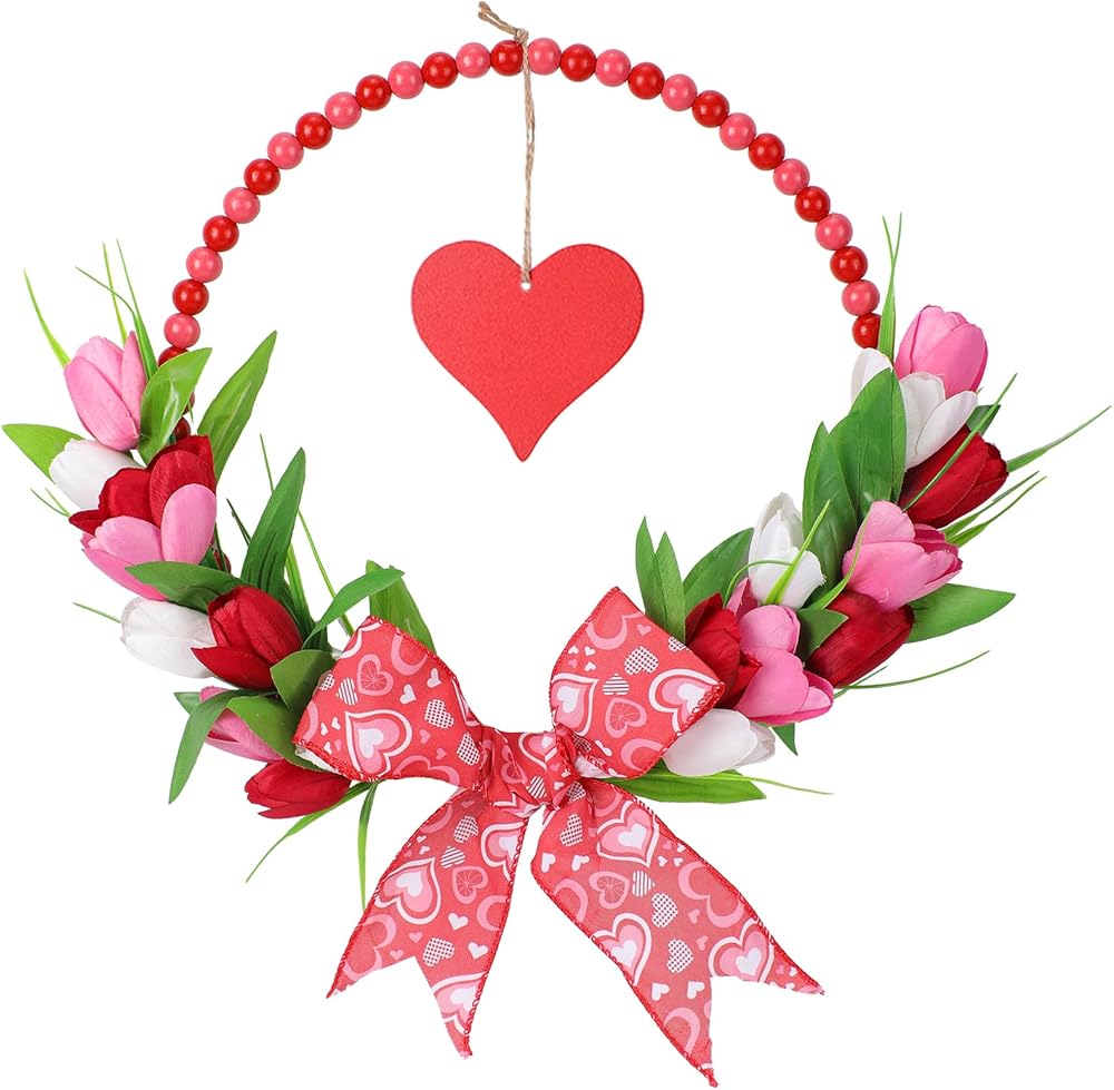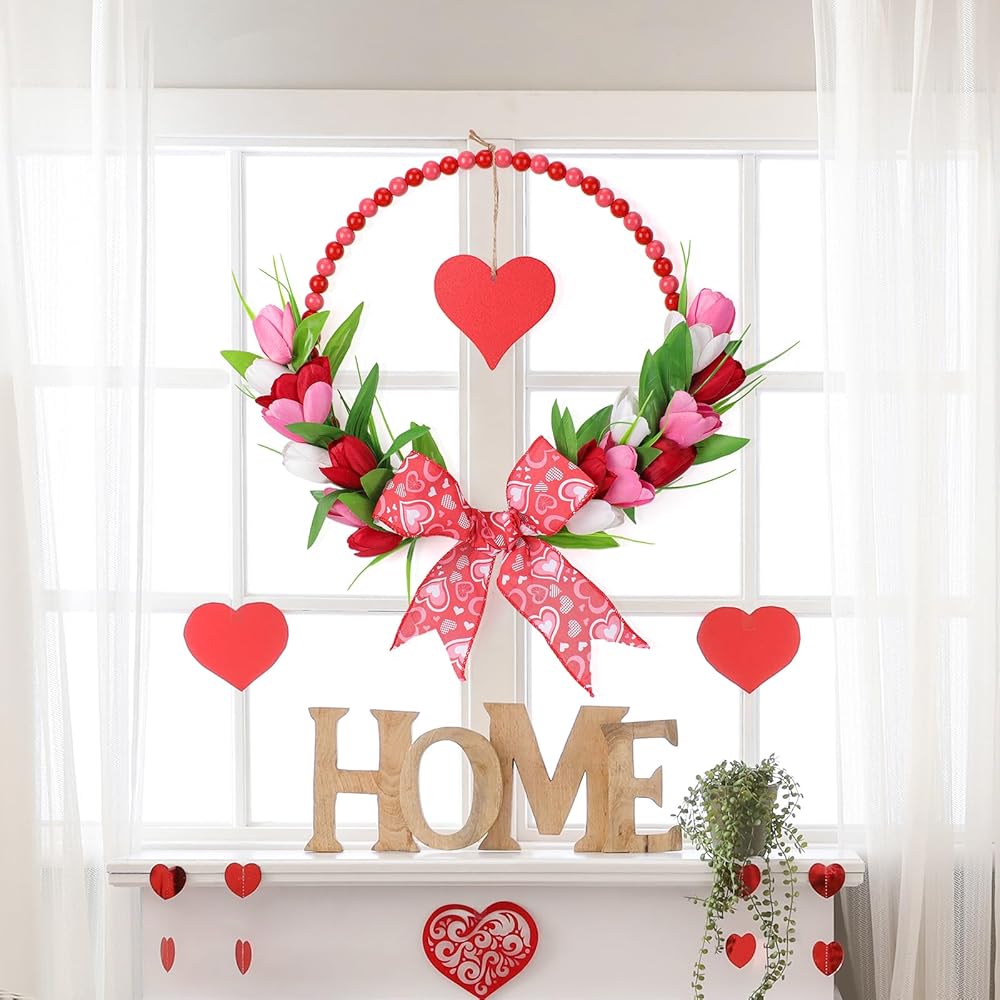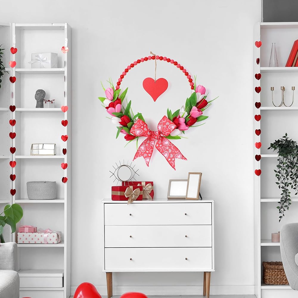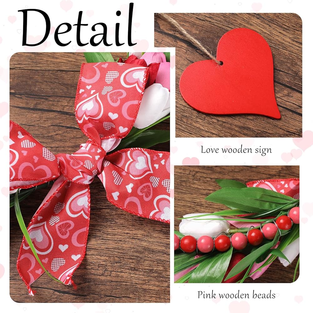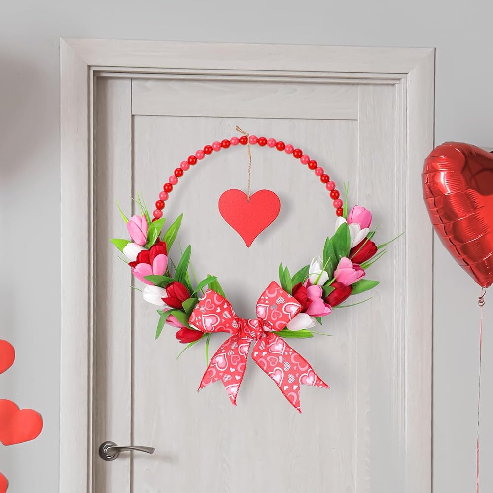 إكليل عيد الحب الوردي للباب الأمامي - أكاليل عيد الحب الخشبية المطرزة مع القوس لنافذة حفل خطوبة الزفاف، إكليل توليب وردي مقاس 33 سم مع قلب أحمر معلق لديكور جدار المنزل في فصل الربيع